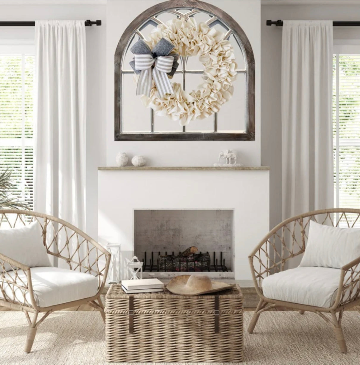 This Burlap wreath measures approximately 19” in diameter as a finished product. Use this white burlap wreath as a front door wreath, wall decor, or as an accessory to add additional style to wall decor such as window shutters, mirror, or picture frame.