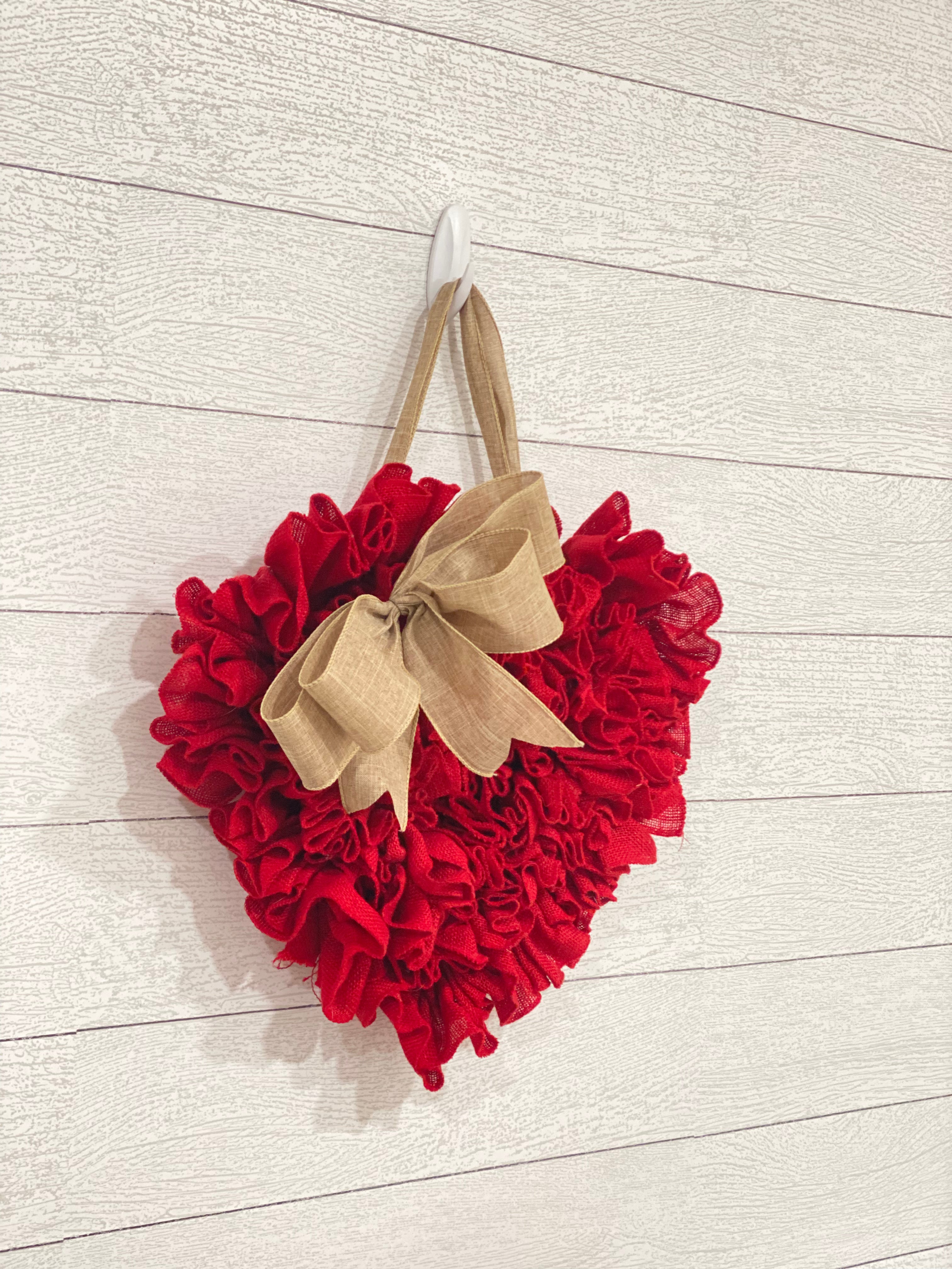 This Valentines Day Wreath made of a rustic red burlap heart wreath and a burlap linen bow will add a pop of color and Valentine’s Day decor to your front door.