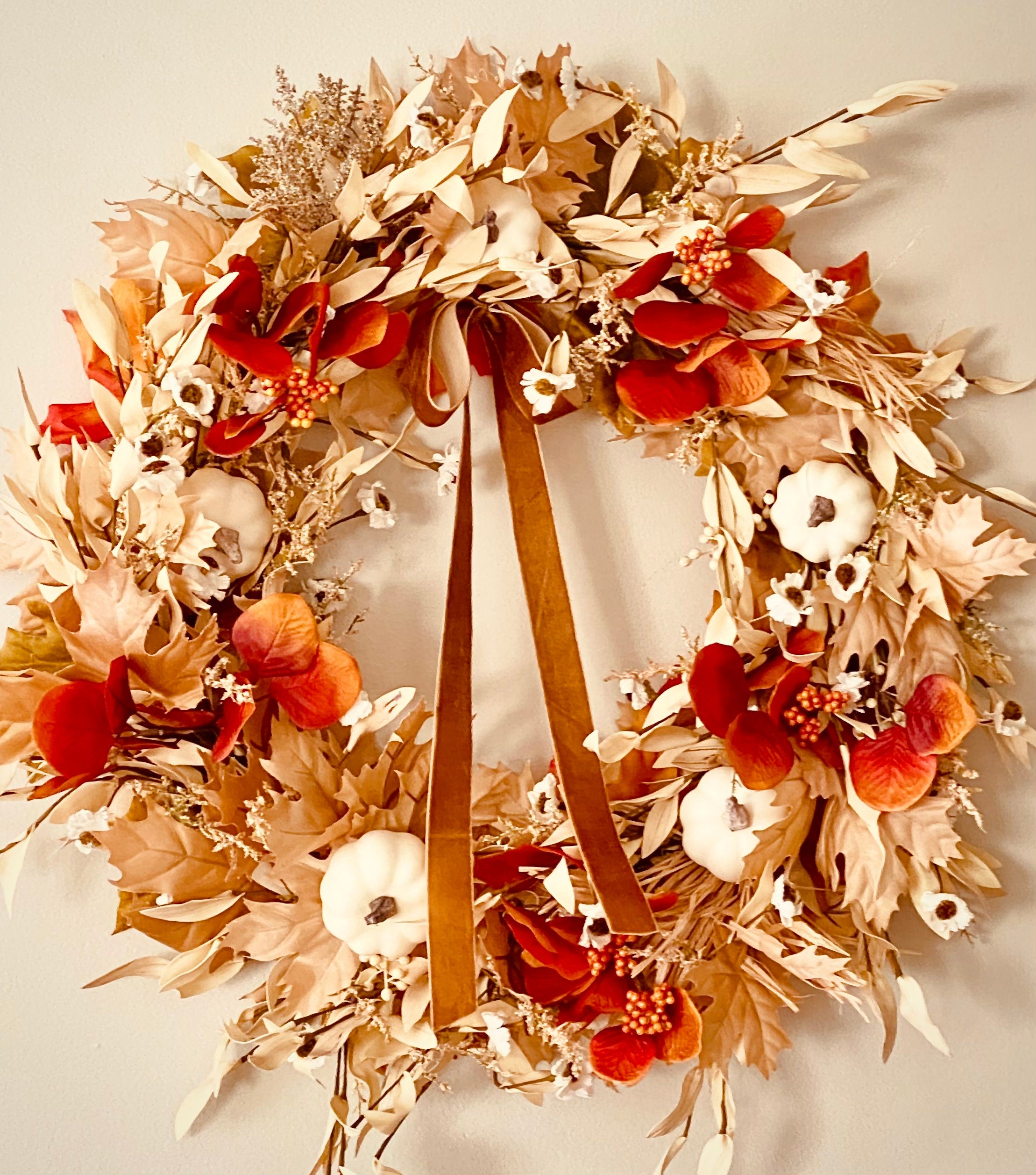 This Neutral Fall Harvest Door Wreath with Pumpkins makes the perfect front door wreath for this Autumn season. The farmhouse pumpkin door hanger is handcrafted from all of the fall essentials, cream, orange and green maple leaves, neutral fall wildflowers, white berries and accented with cream pumpkins and vibrant burnt orange and crimson eucalyptus leaves.