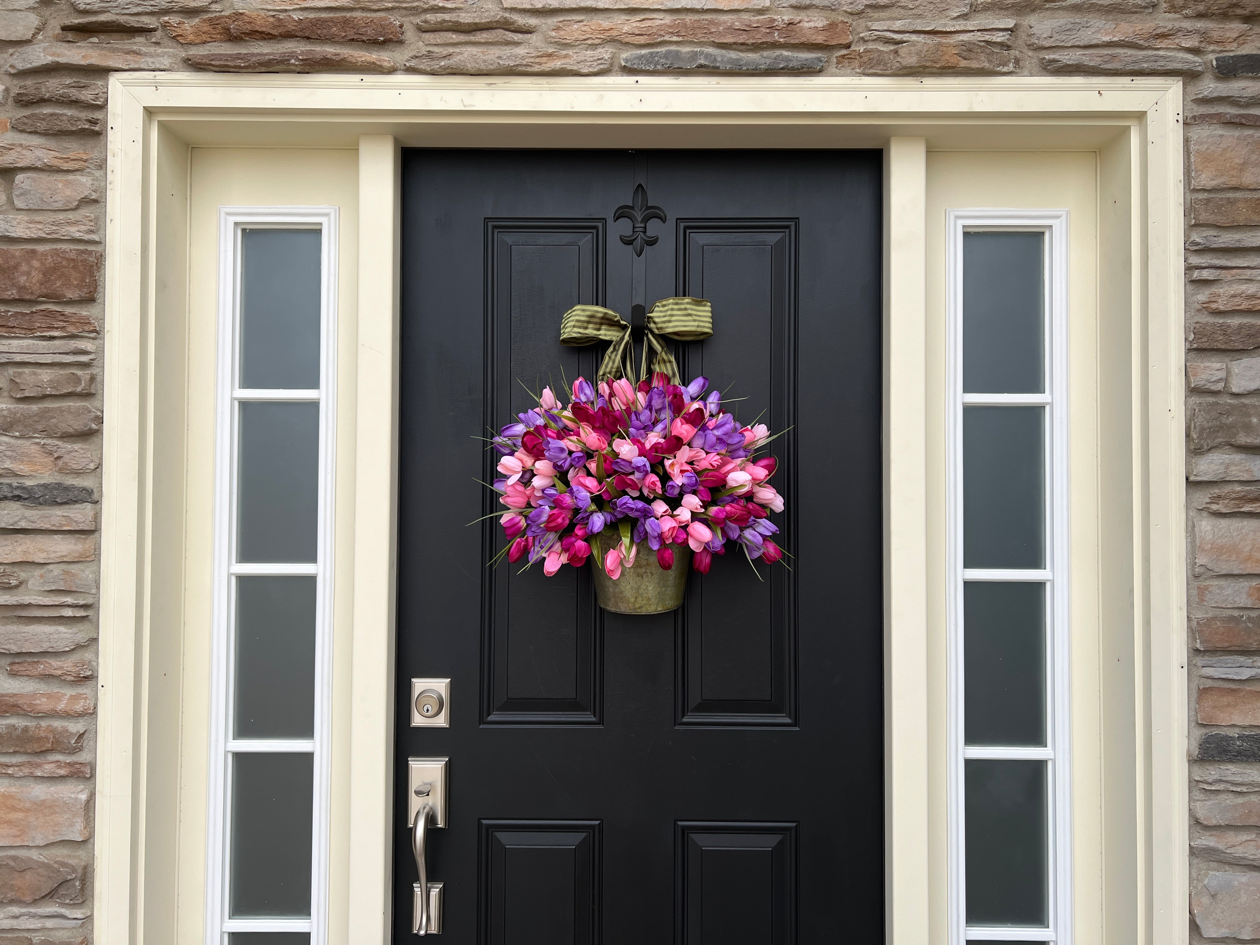 Brighten your entryway this spring with our Pink and Purple Tulip Bucket Wreath. Featuring a stunning combination of vibrant pink and purple tulips, this spring bucket adds a cheerful and fresh touch to your front door or home decor. Perfect for celebrating the season, it creates a welcoming atmosphere with its lively floral design. A must-have for anyone looking to add a pop of spring charm to their space.