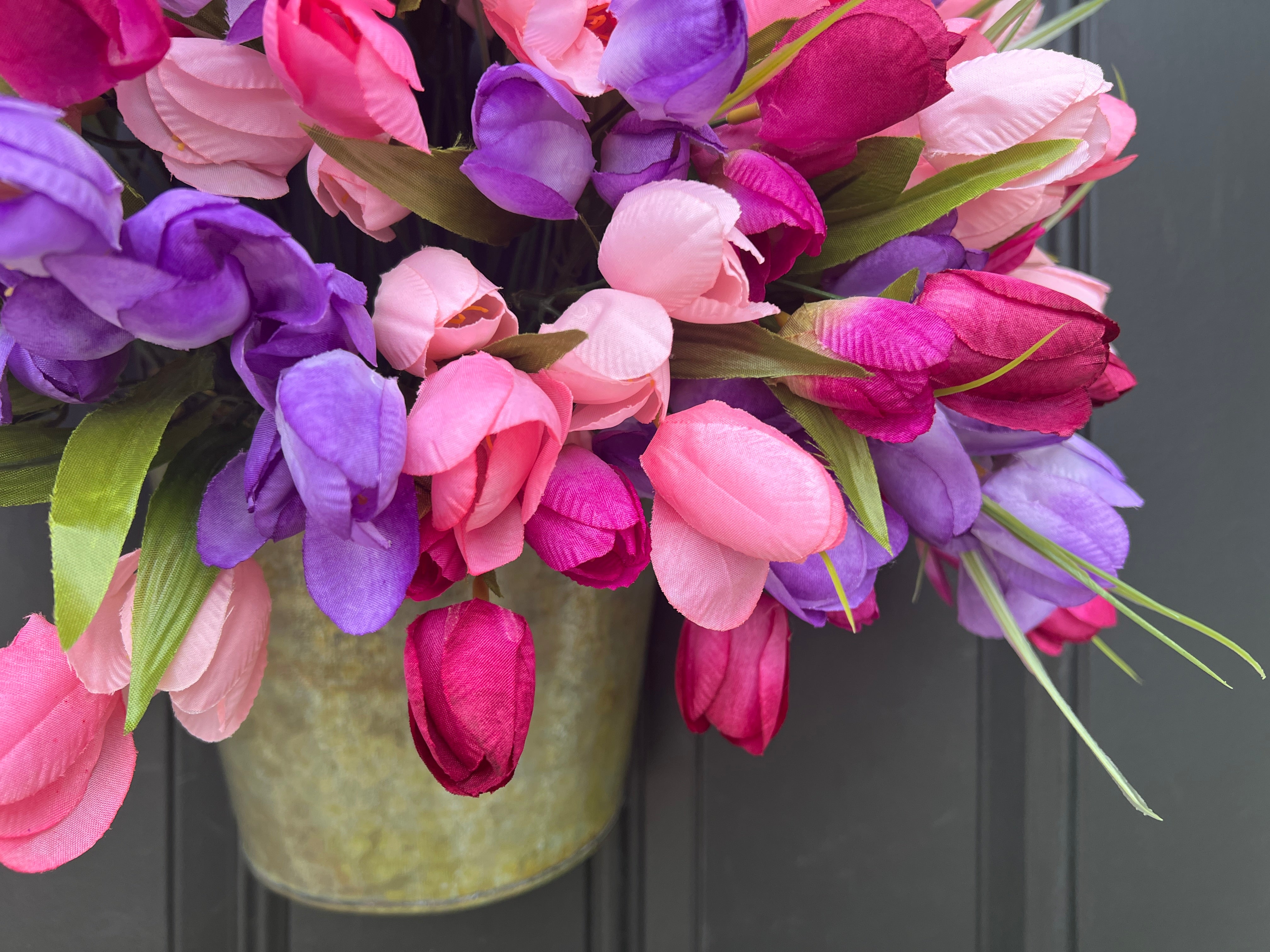 • Pink and Purple Tulip Bucket Wreath for Spring, Front Door Galvanized Container with Tulips