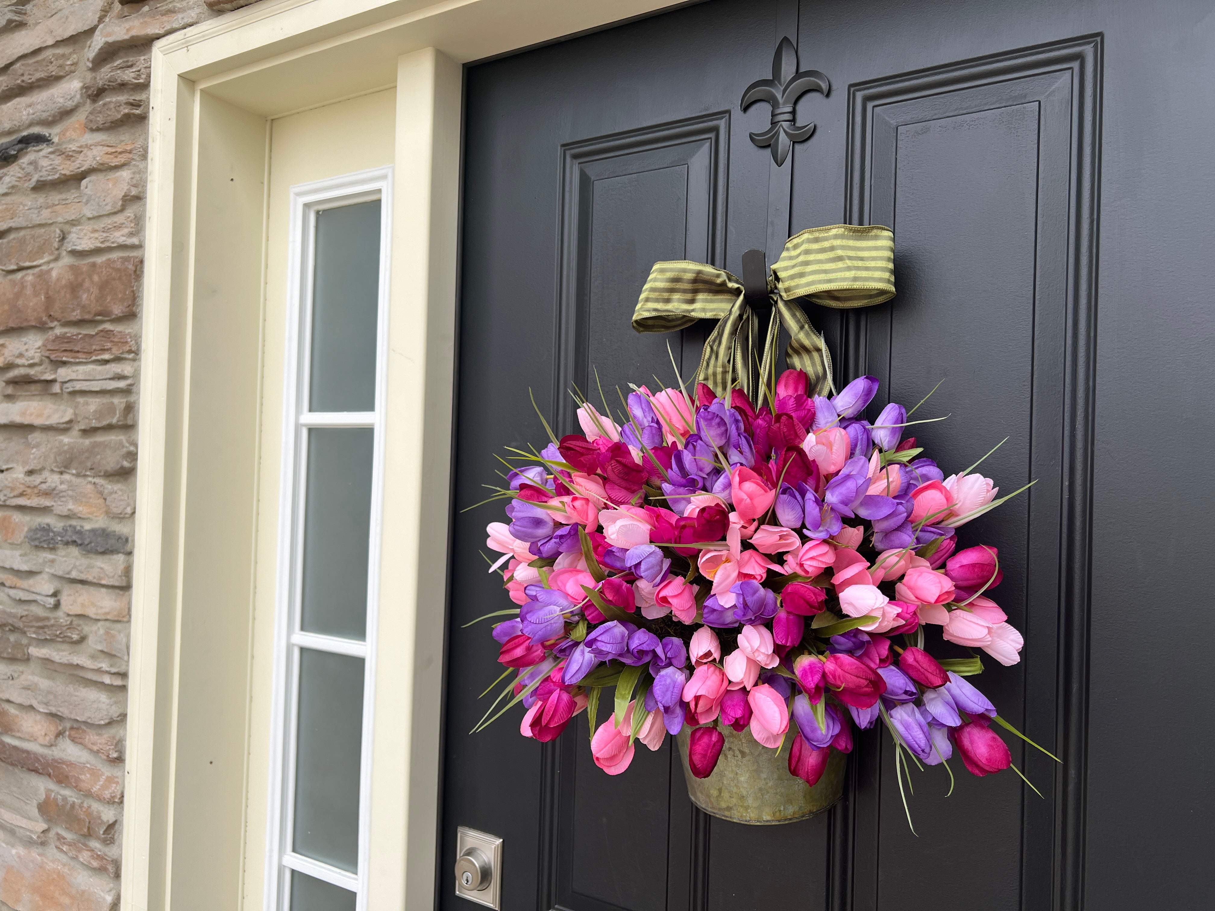 Brighten your entryway this spring with our Pink and Purple Tulip Bucket Wreath. Featuring a stunning combination of vibrant pink and purple tulips, this spring bucket adds a cheerful and fresh touch to your front door or home decor. Perfect for celebrating the season, it creates a welcoming atmosphere with its lively floral design. A must-have for anyone looking to add a pop of spring charm to their space.