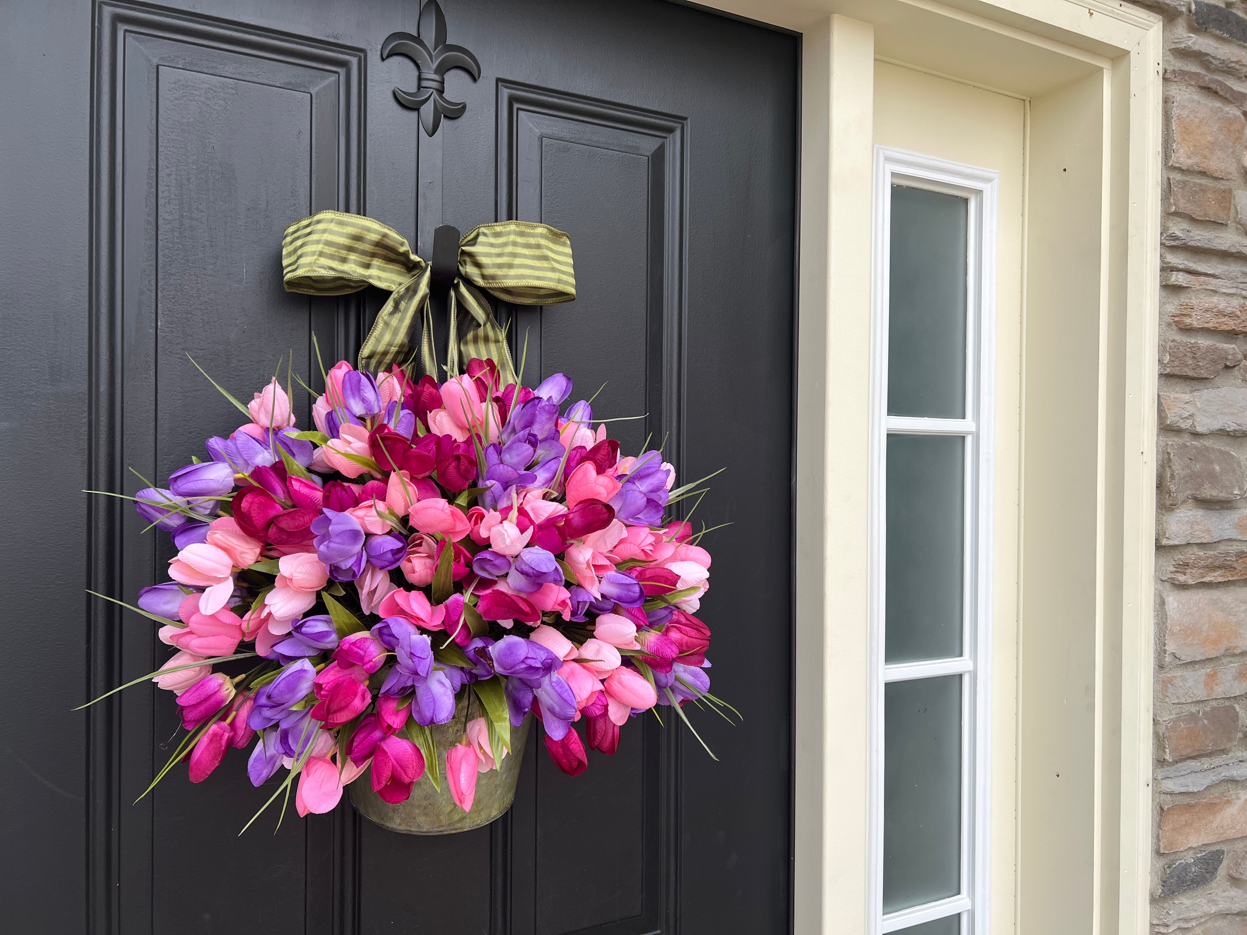 Brighten your entryway this spring with our Pink and Purple Tulip Bucket Wreath. Featuring a stunning combination of vibrant pink and purple tulips, this spring bucket adds a cheerful and fresh touch to your front door or home decor. Perfect for celebrating the season, it creates a welcoming atmosphere with its lively floral design. A must-have for anyone looking to add a pop of spring charm to their space.
