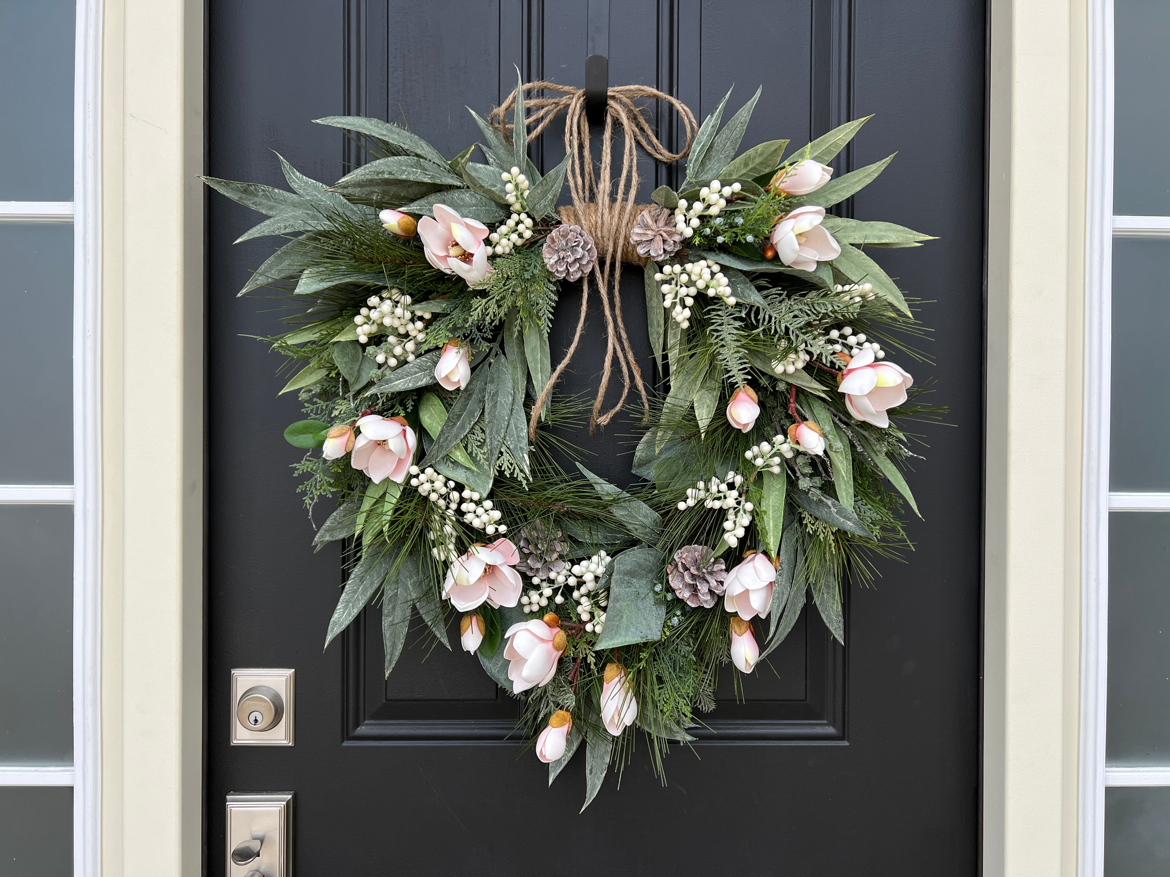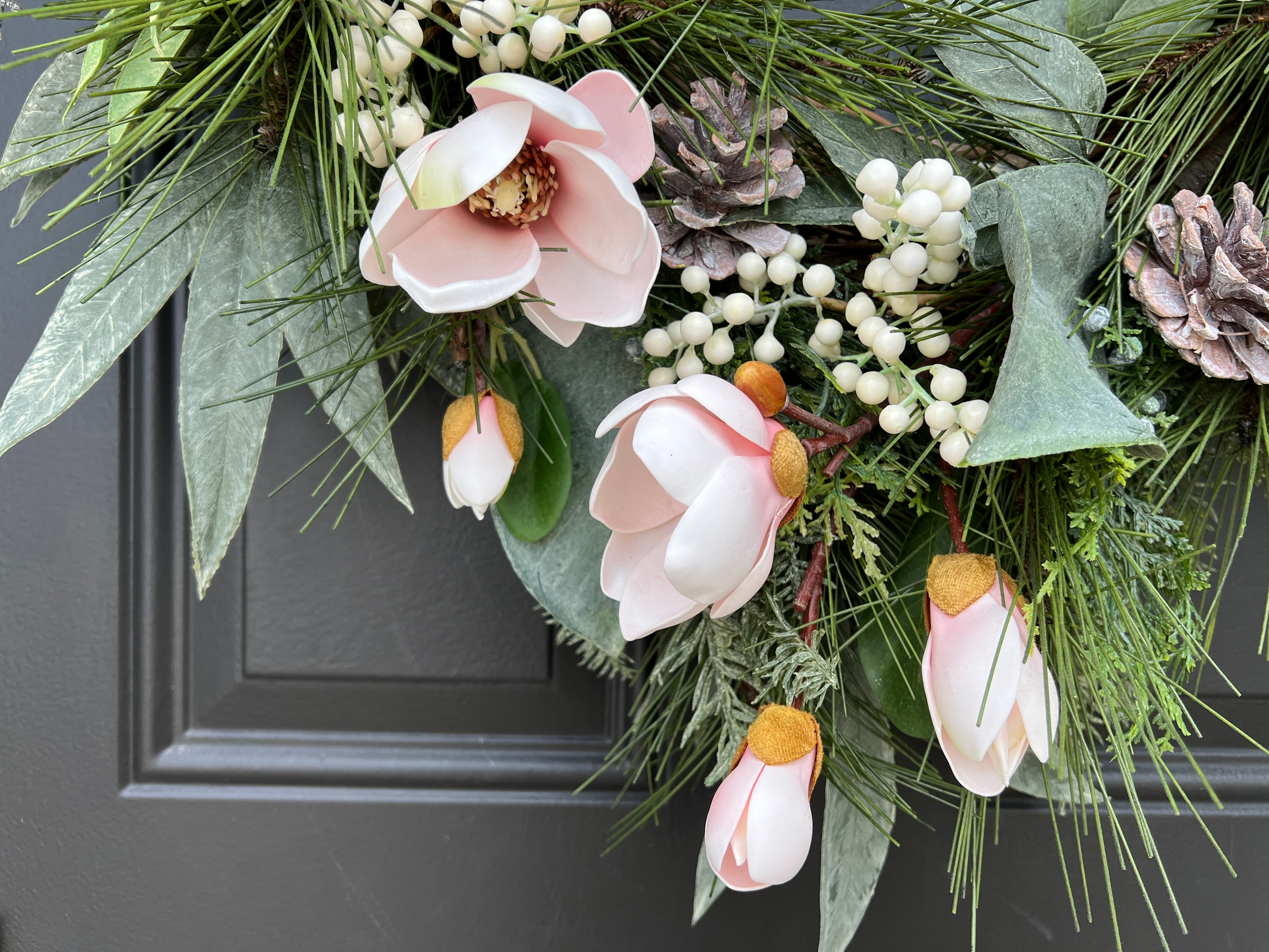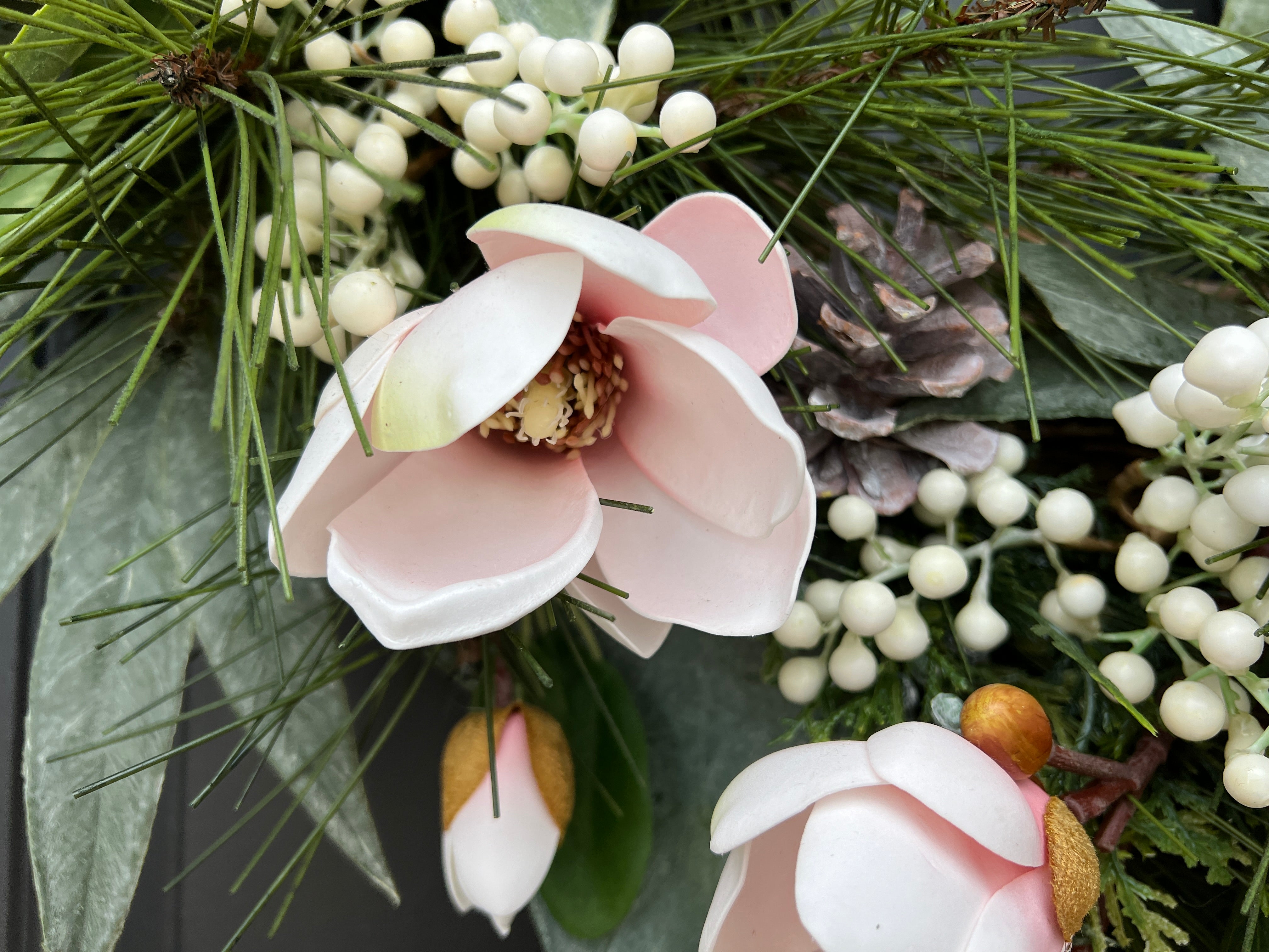 Experience the serene essence of nature with our exquisitely crafted Pink Magnolia Winter wreath. Crafted with lifelike pink magnolia, winter berries, pine branches, eucalyptus leaves, and natural pinecones, this wreath captures the tranquil beauty of a snow-covered forest. The rustic jute bow adds a charming touch, making it a delightful addition to your covered front door or indoor holiday decor.