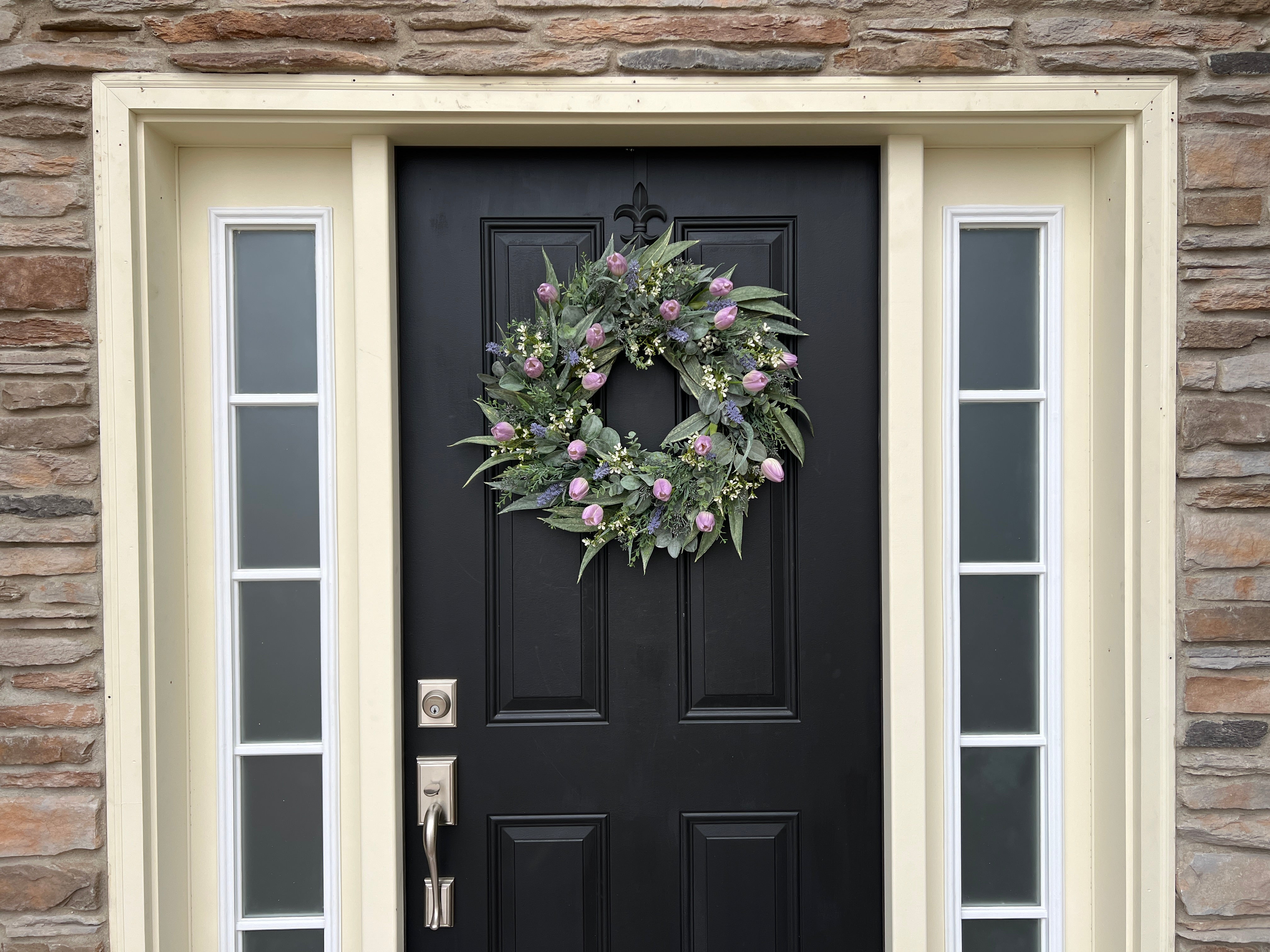 Add a burst of spring color to your home with this Purple Tulip Wreath. Perfect for your front door or porch, this beautiful wreath features lifelike purple tulips paired with vibrant lavender and lush greenery. Ideal for spring décor, it brings a fresh, welcoming touch to any entryway. The combination of rich purples and calming lavender creates a sophisticated, yet inviting look that enhances your home’s curb appeal. Whether you're decorating for the season or looking for a thoughtful gift, this spring tulip wreath is the perfect way to celebrate the arrival of warmer weather with timeless elegance and charm. Perfect for welcoming guests and brightening up any space.