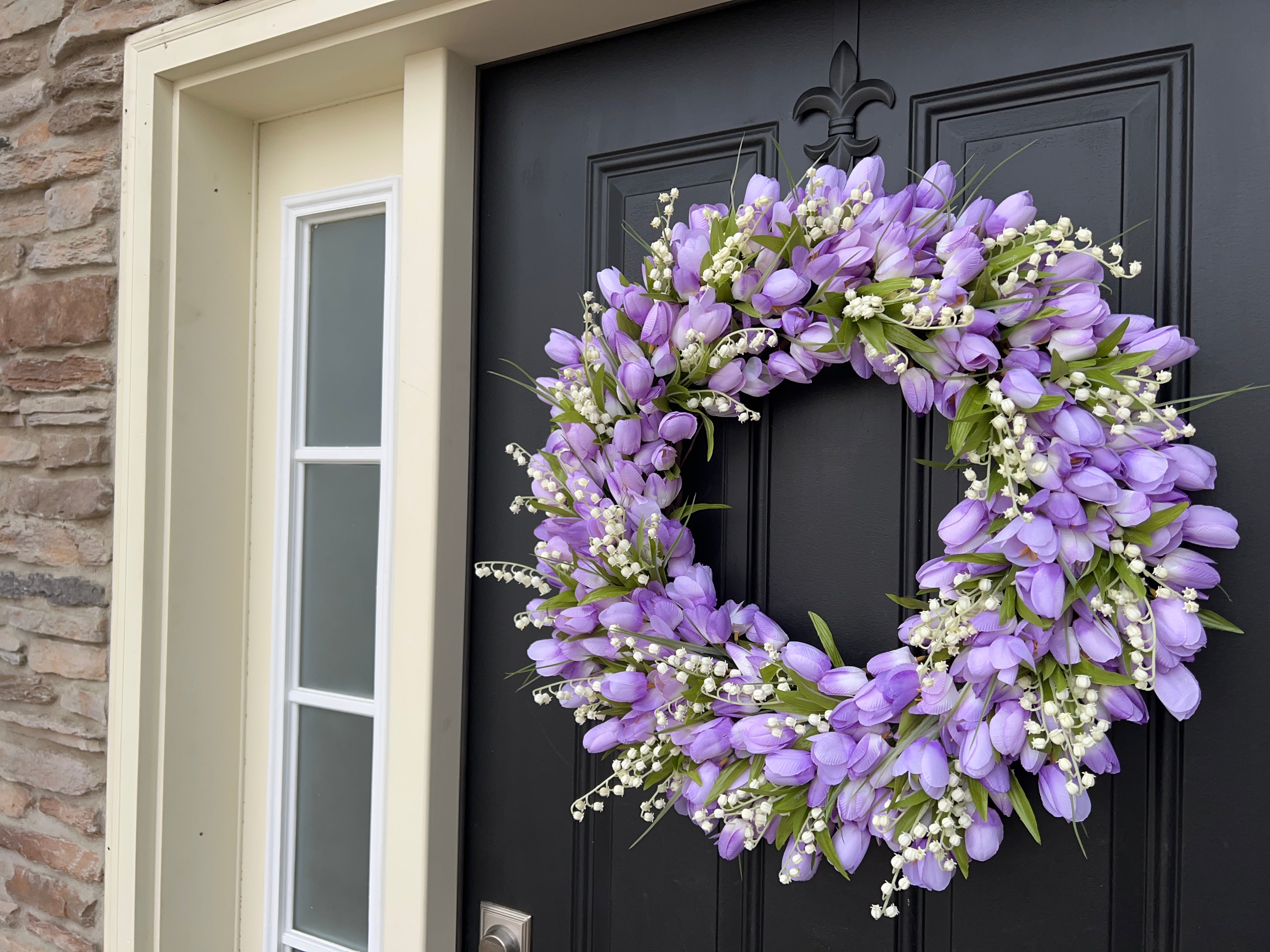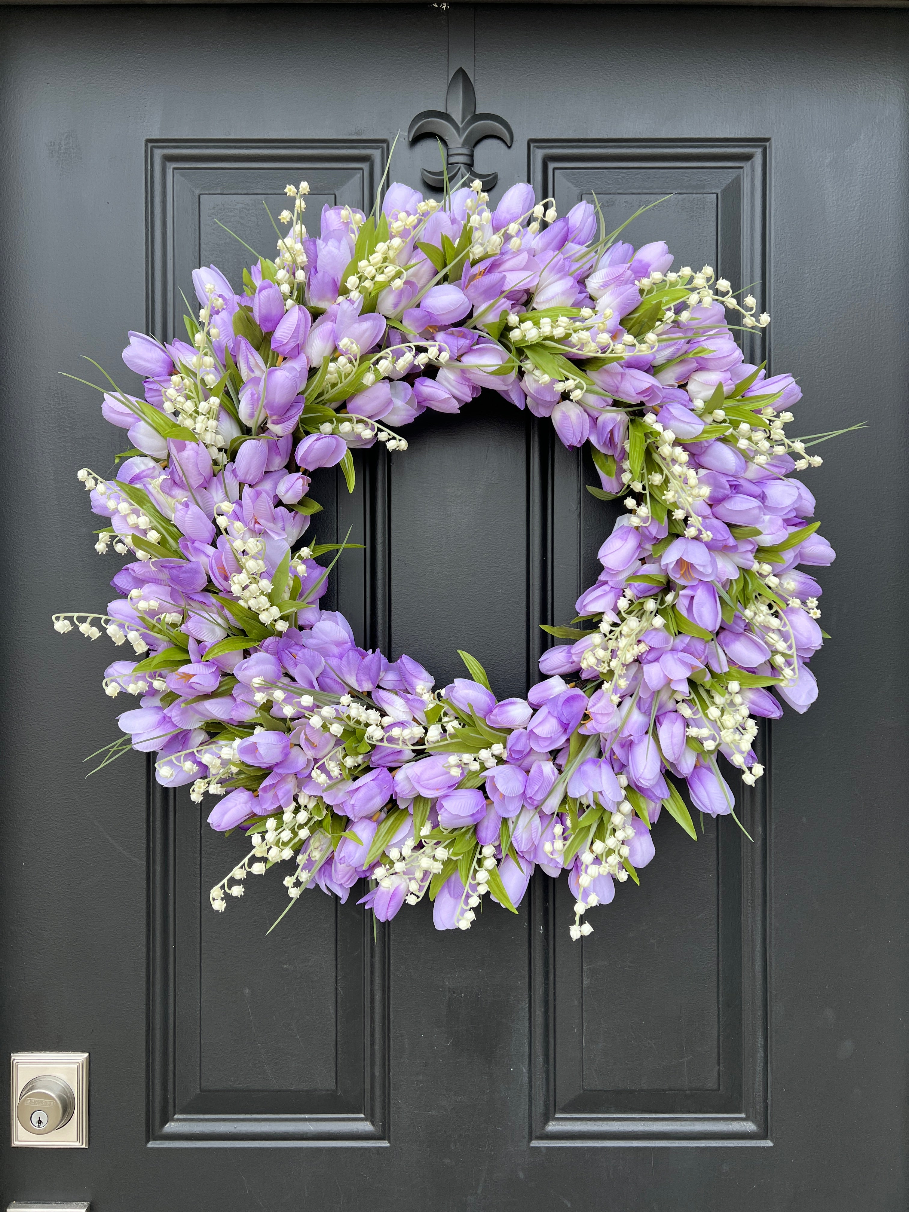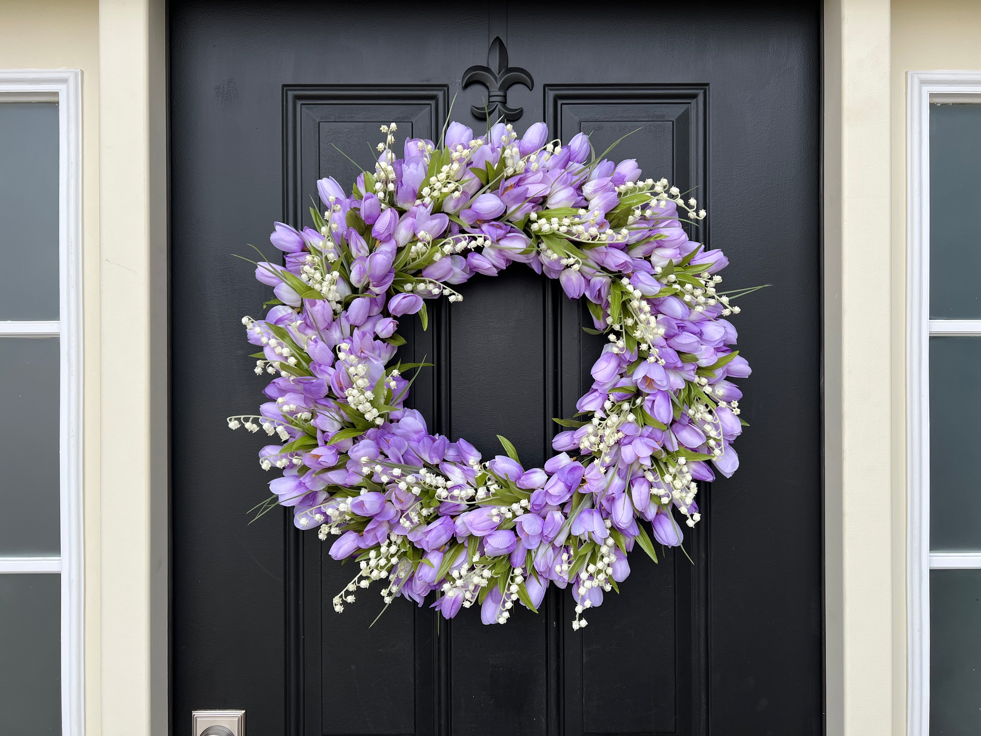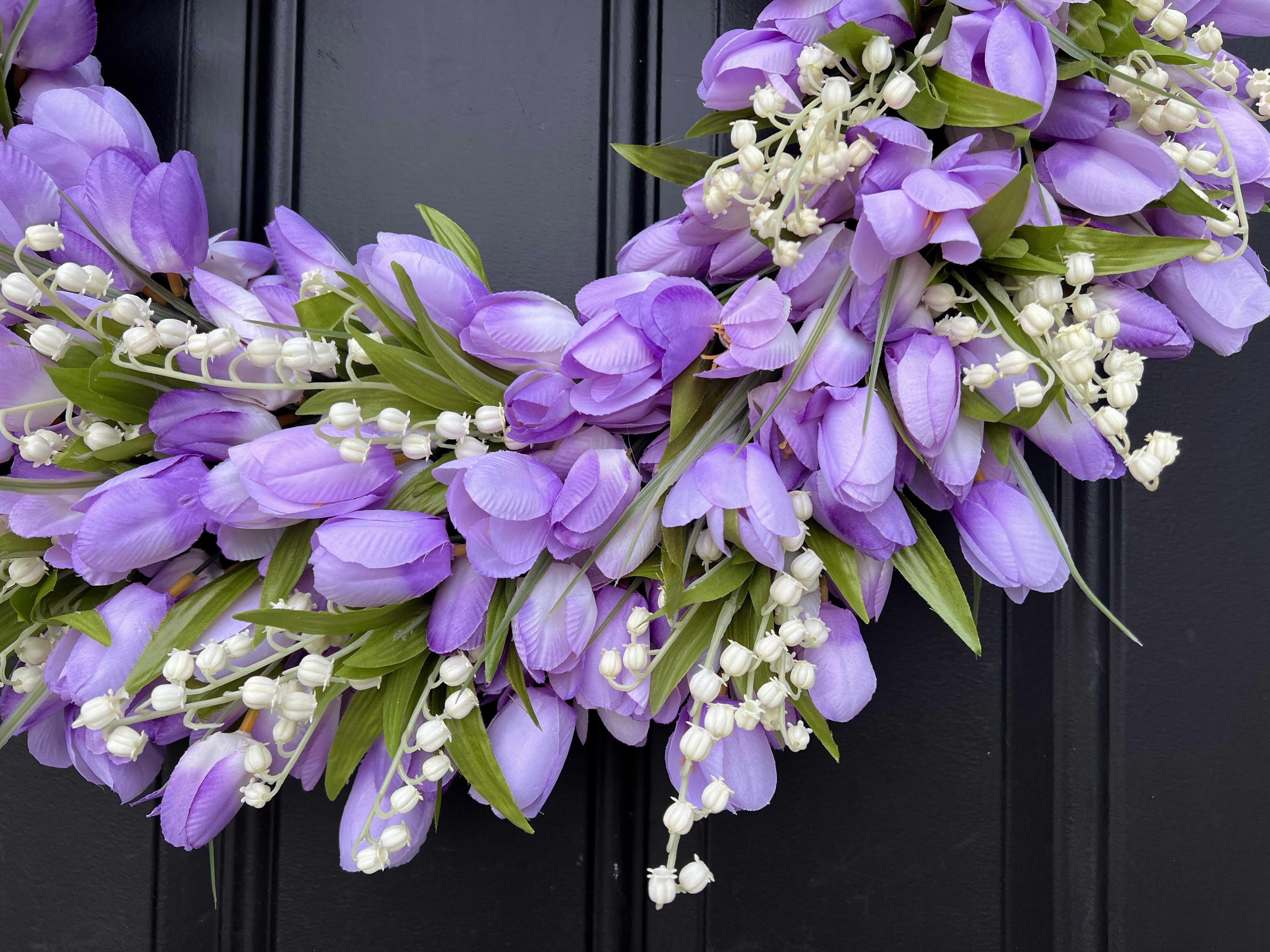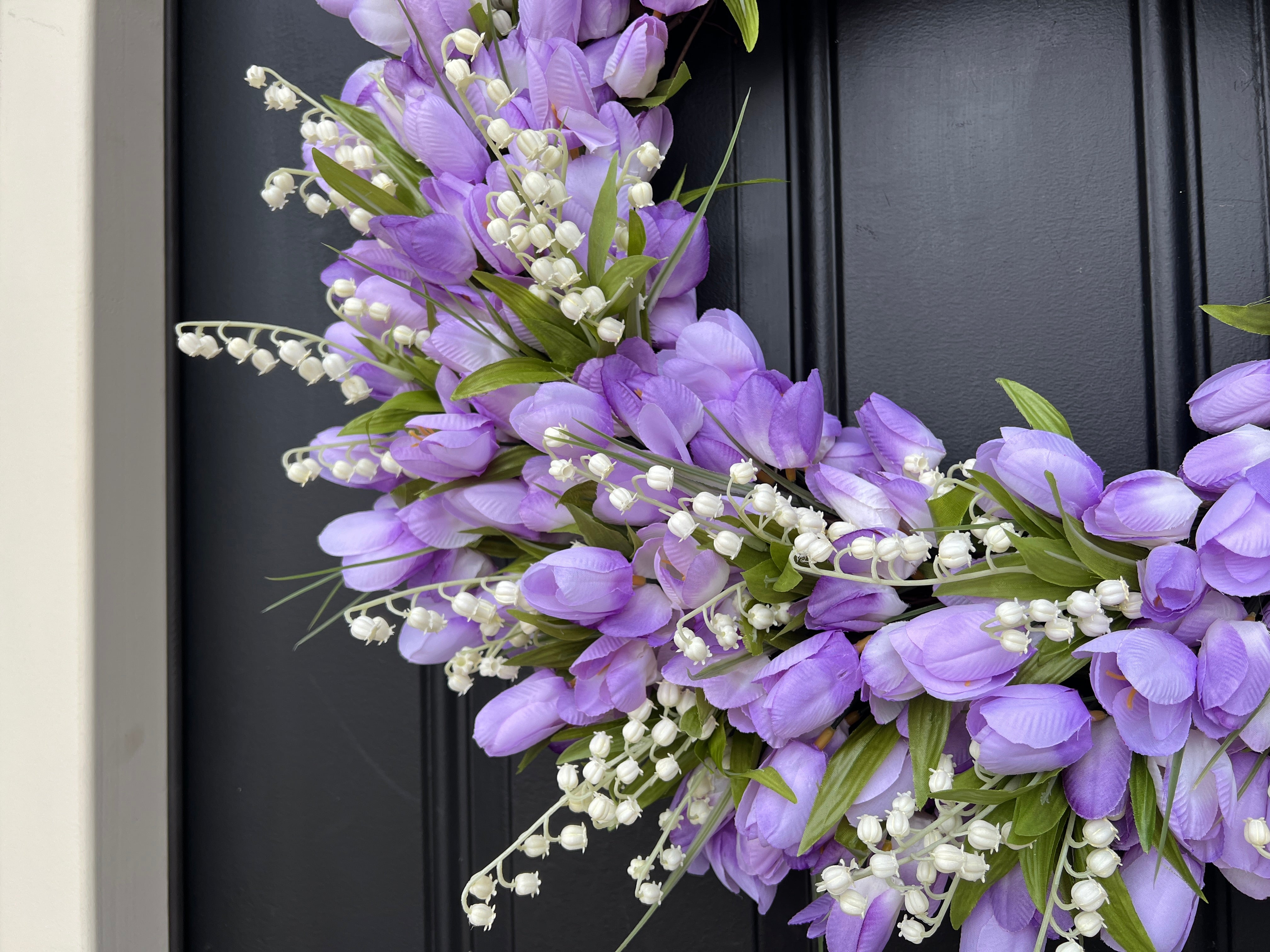 Welcome spring with our stunning Purple Tulip Wreath, beautifully adorned with delicate Lily of the Valley accents. This vibrant wreath features a rich mix of purple tulips and the timeless elegance of lily of the valley, making it the perfect addition to your front door.