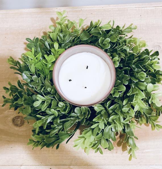 This small farmhouse wreath for cabinets is made with faux boxwood greenery and a small grapevine wreath frame. These mini cabinet wreaths add a pop of Greenery to your farmhouse charm. Use these wreaths to add warmth to any kitchen, wall decor, or tablescape as a centerpiece To hold candles. These can also function as chair wreaths that can be used as wreaths for the back of a chair.