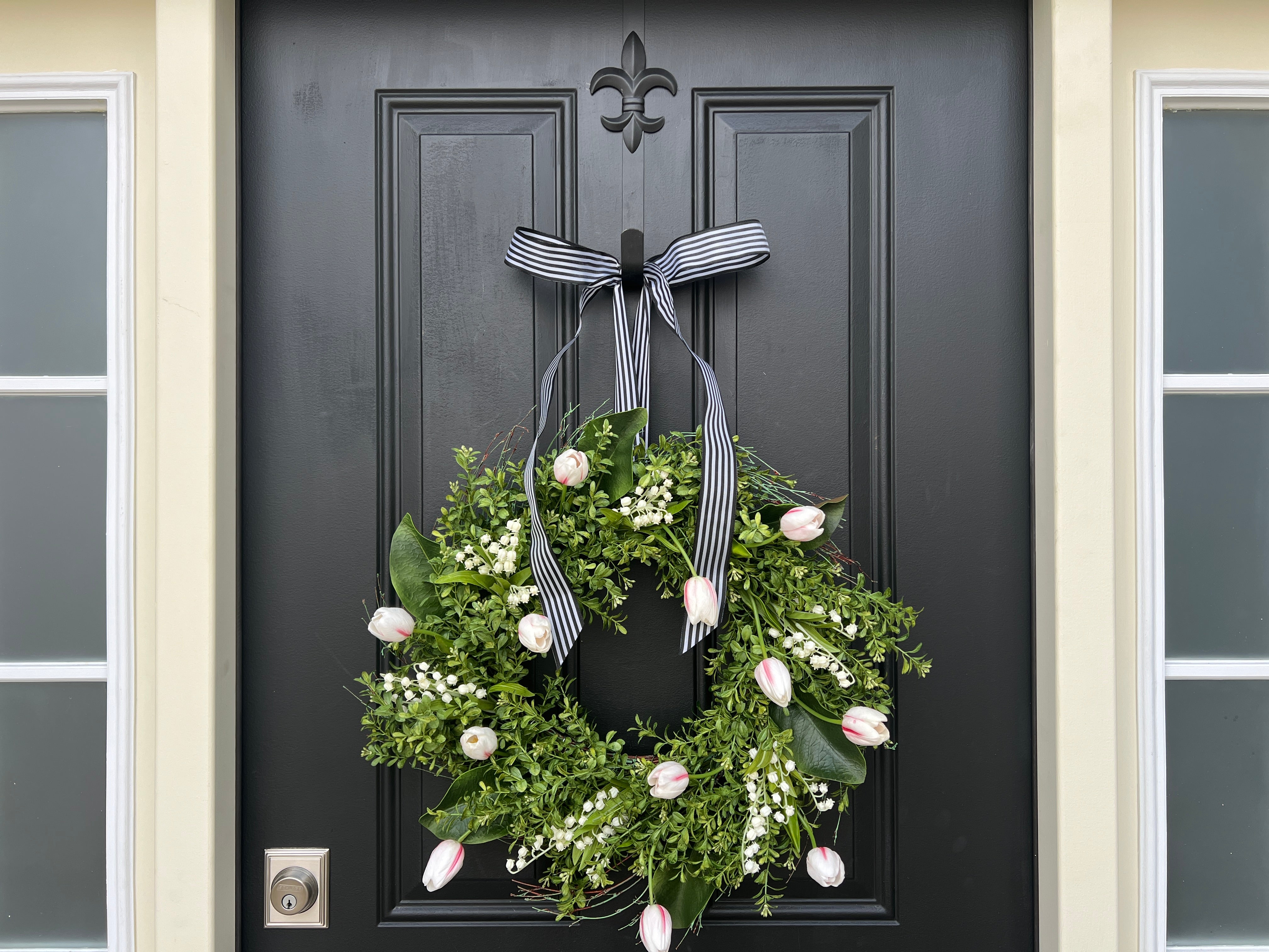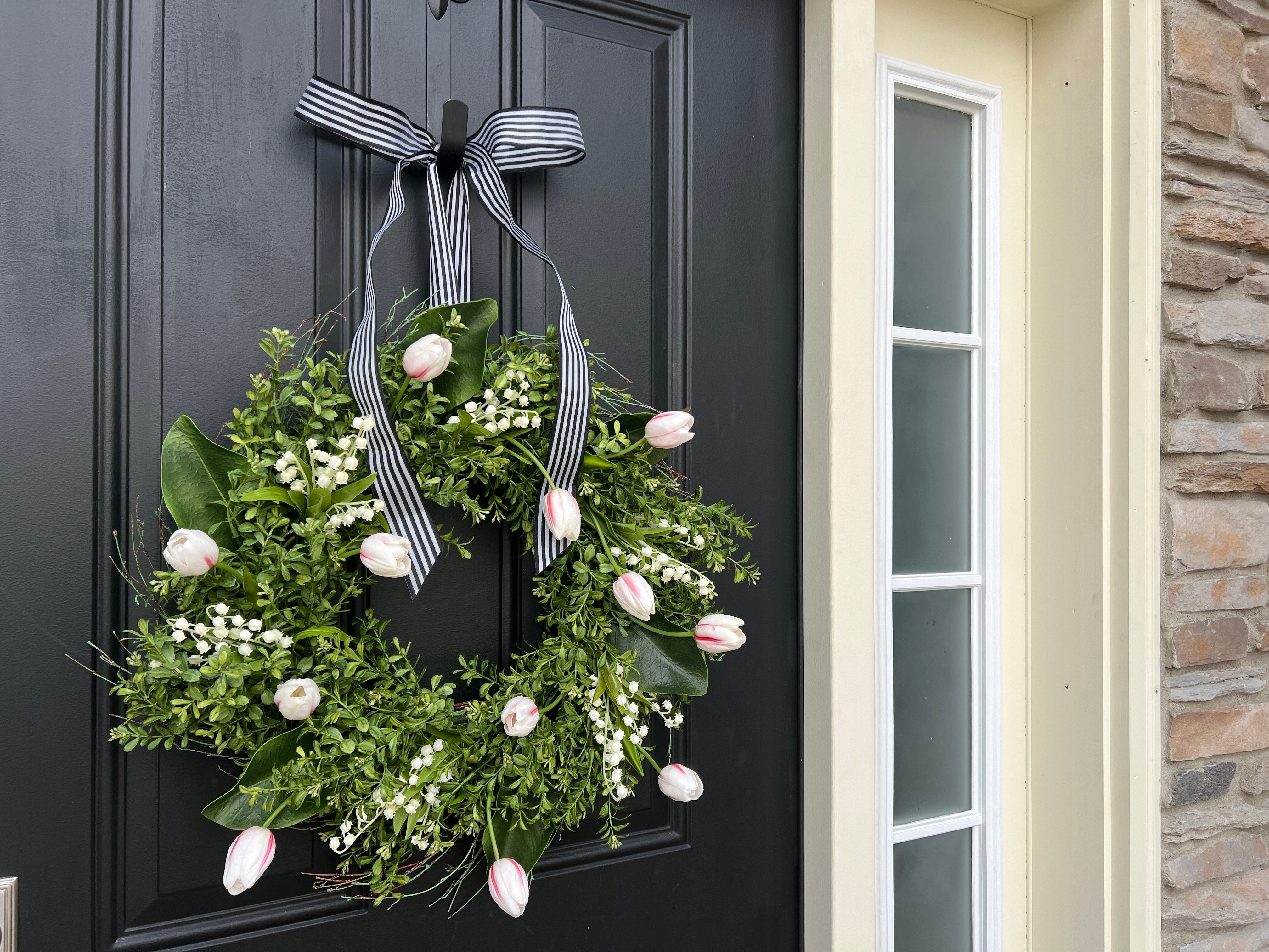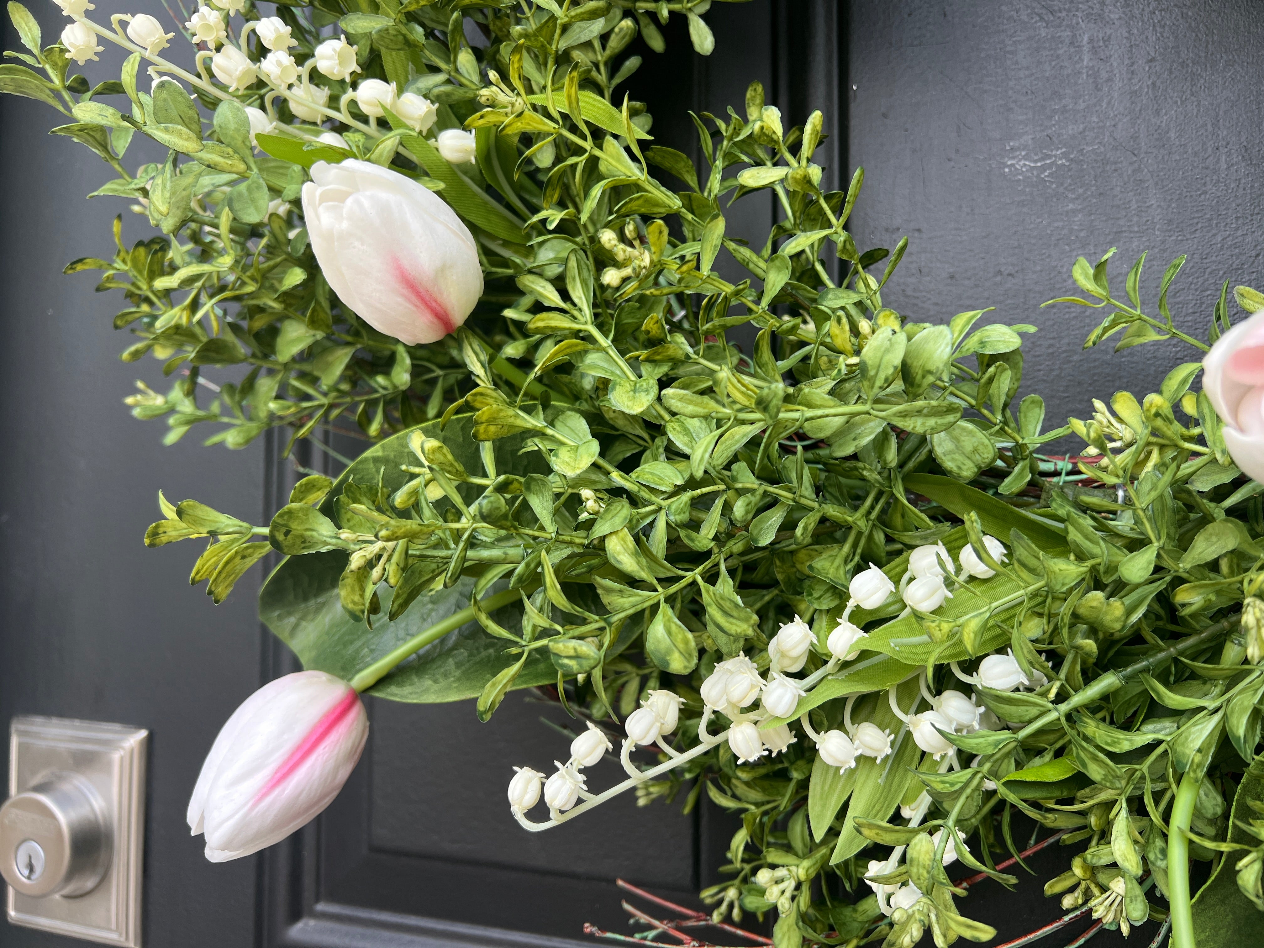 Celebrate the season with this charming Simple Boxwood Greenery Wreath, featuring soft Easter Tulips and delicate Lily of the Valley blooms. Perfect for adding a fresh, spring-inspired touch to your home, this wreath brings the beauty of nature indoors and outdoors with its elegant, timeless design.