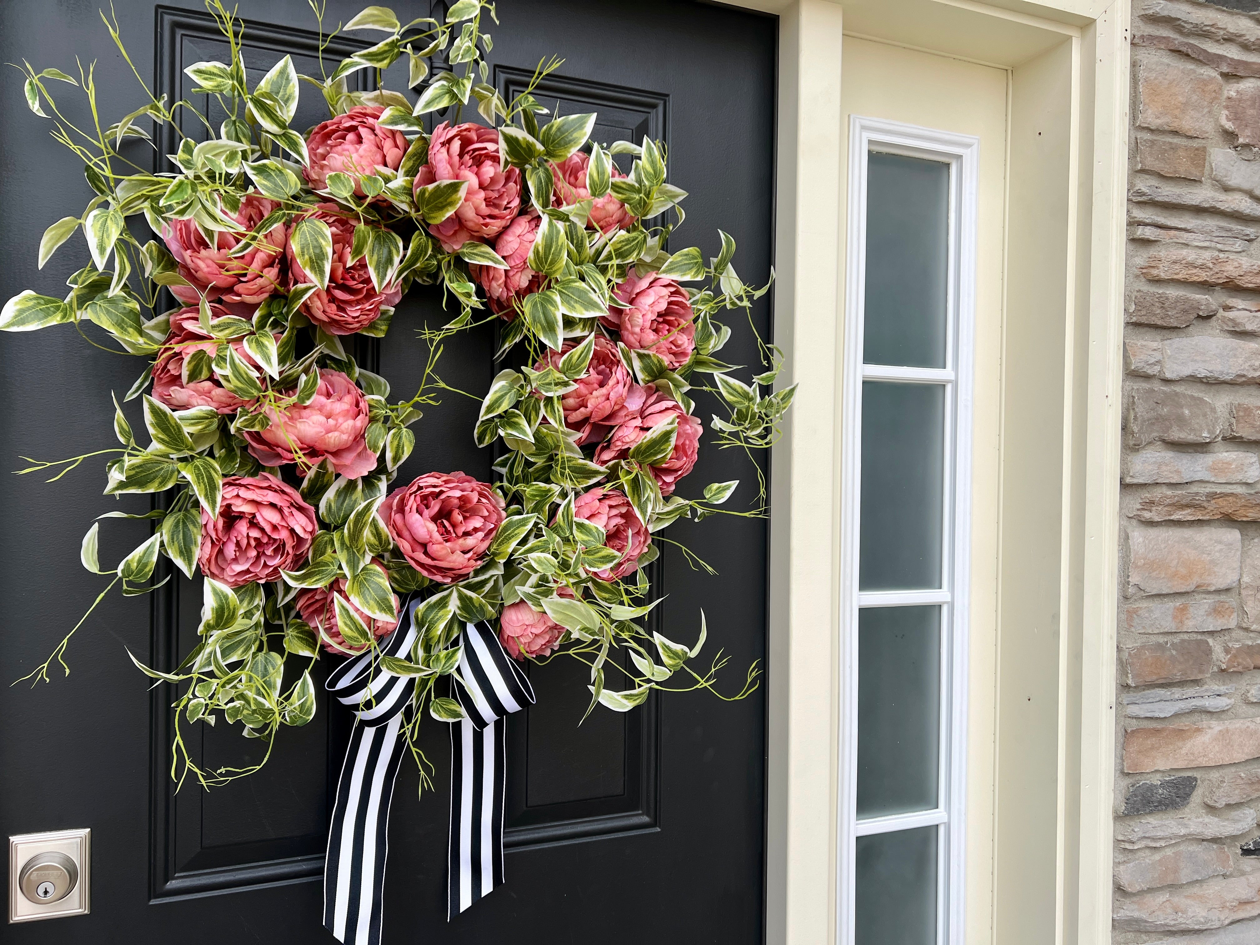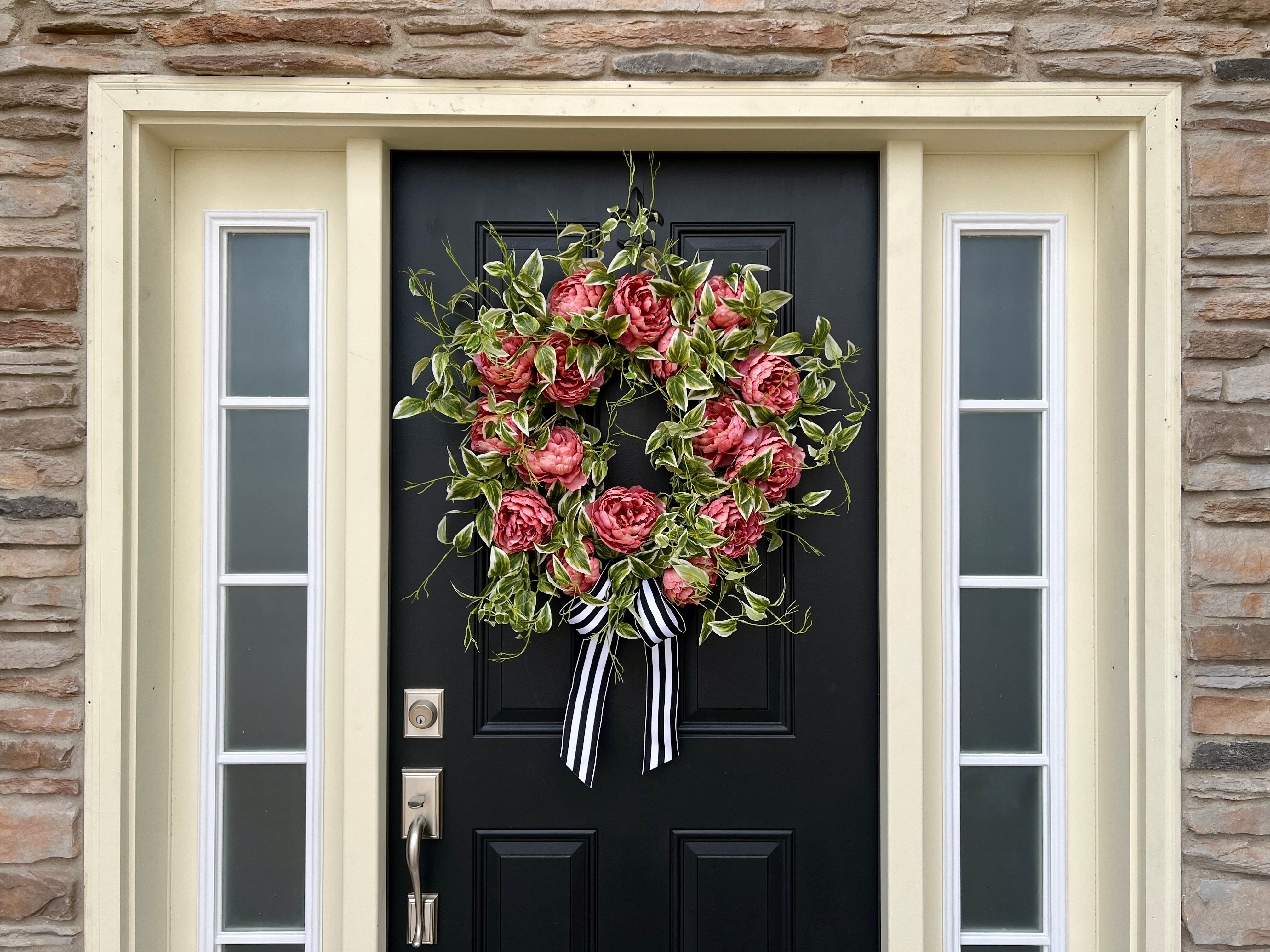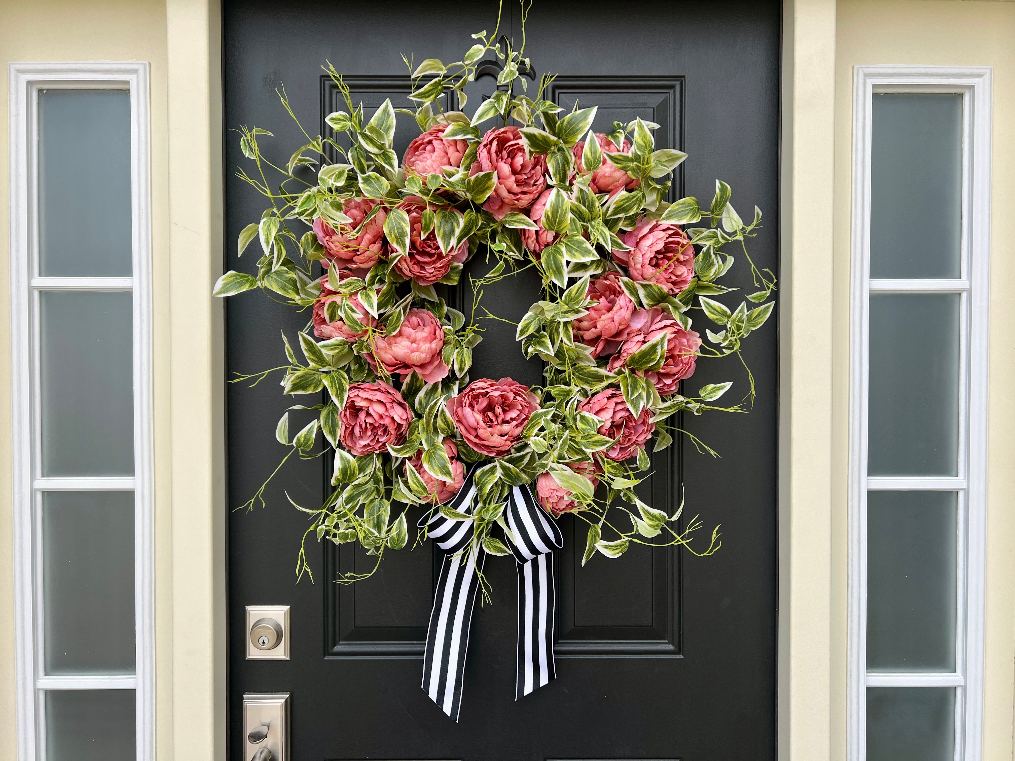 Add a touch of elegance to your home with our Spring Peony Wreath, featuring lush coral peonies and delicate variegated ivy. This vibrant front door decor exudes natural beauty, perfect for welcoming guests and brightening any entrance. Handcrafted with care, the intertwining ivy adds texture and charm to the stunning peony blooms, creating a sophisticated yet inviting look for your home this spring season.
