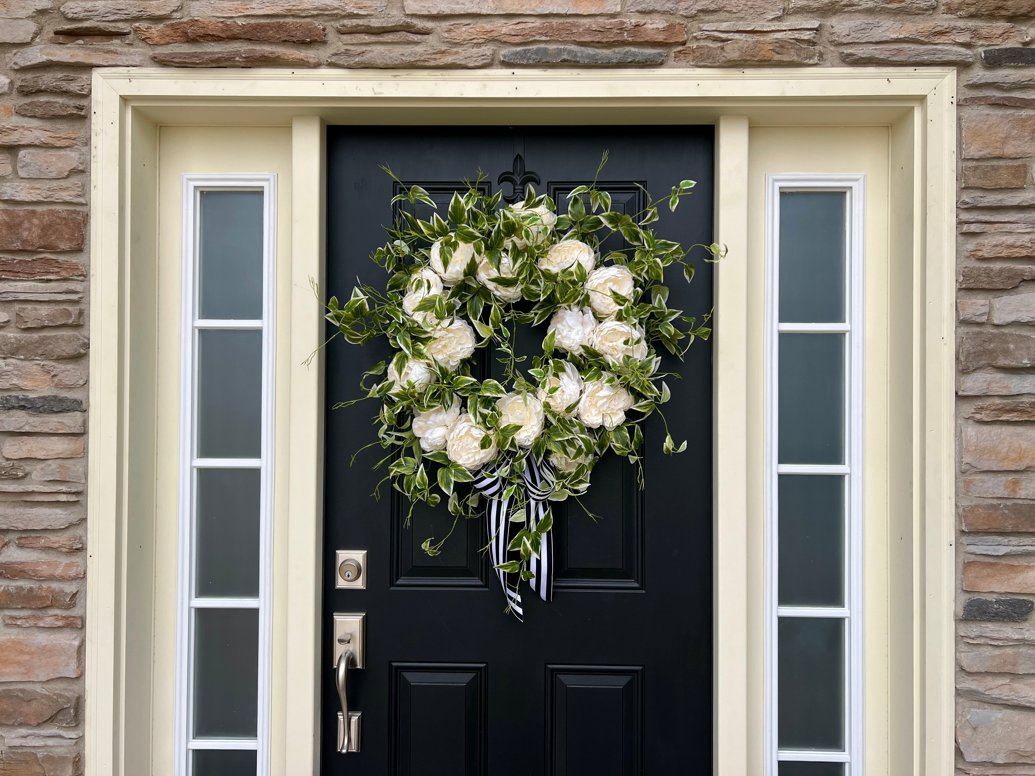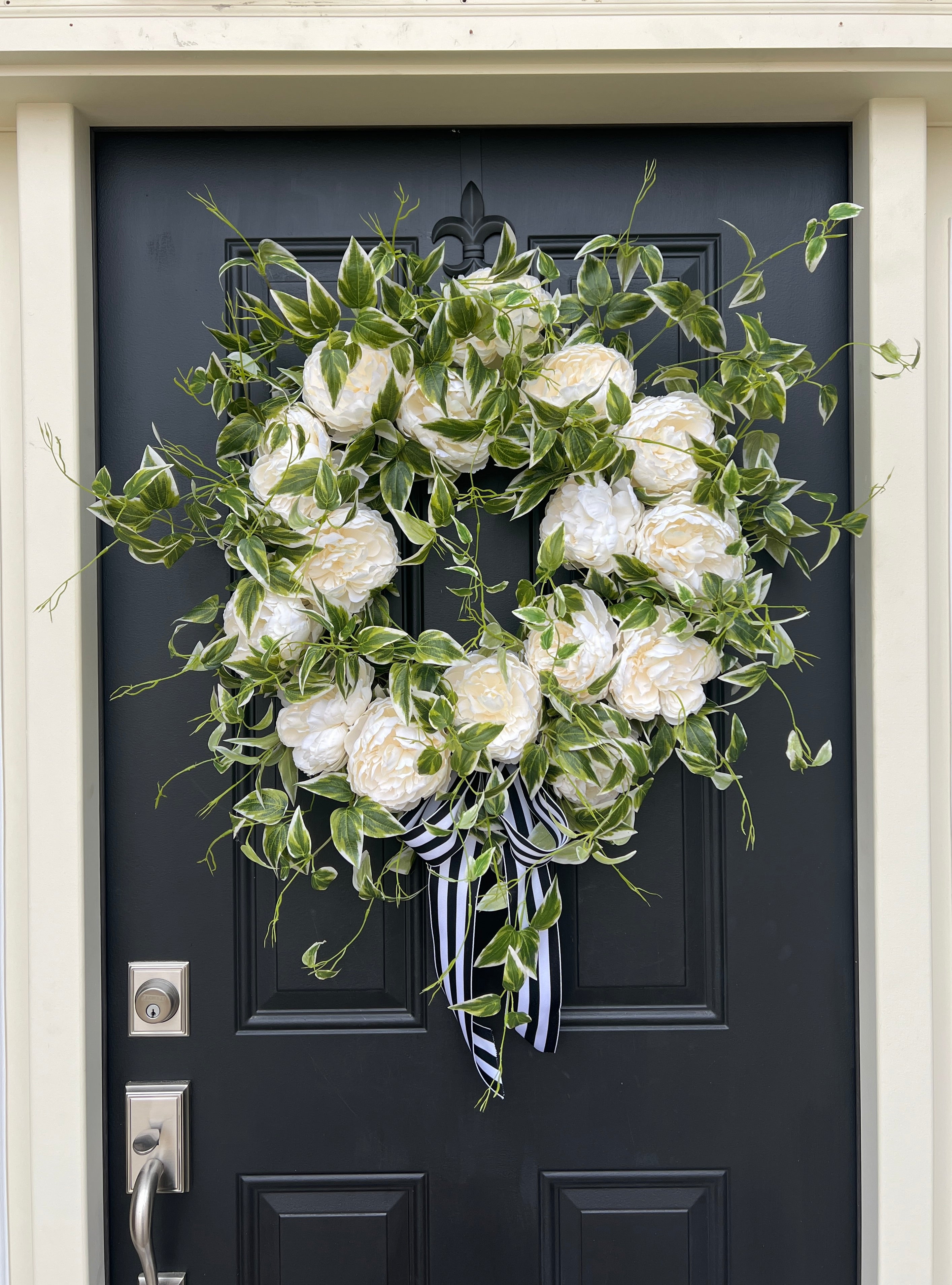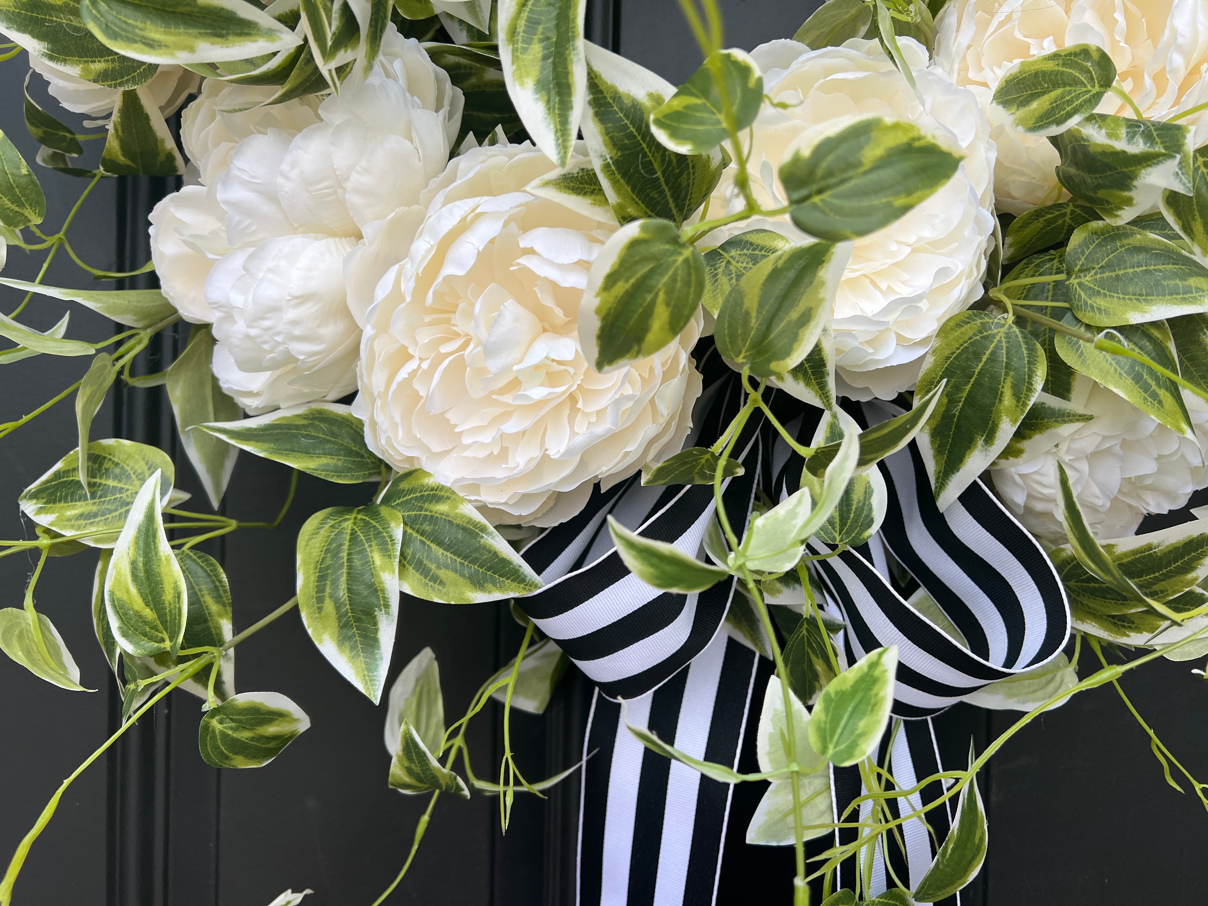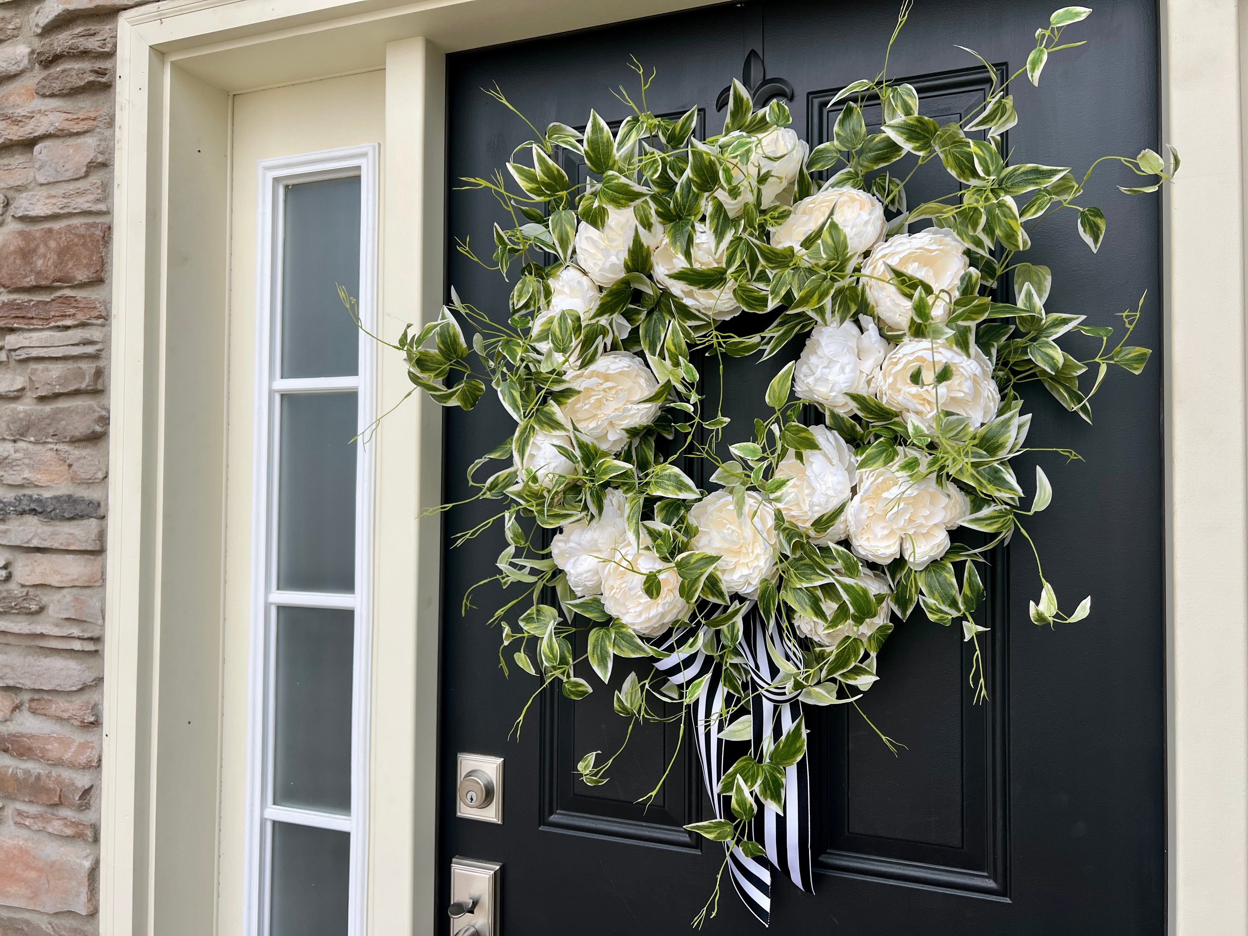 Celebrate love with our Spring Peony Wreath, featuring stunning white peony blooms and cascading variegated ivy. Perfect as wedding decor, bridal shower decorations, or a thoughtful gift for her. This elegant wreath adds a fresh, romantic touch to any space, making it an ideal choice for celebrating special moments. Handcrafted with care for a sophisticated and timeless look.