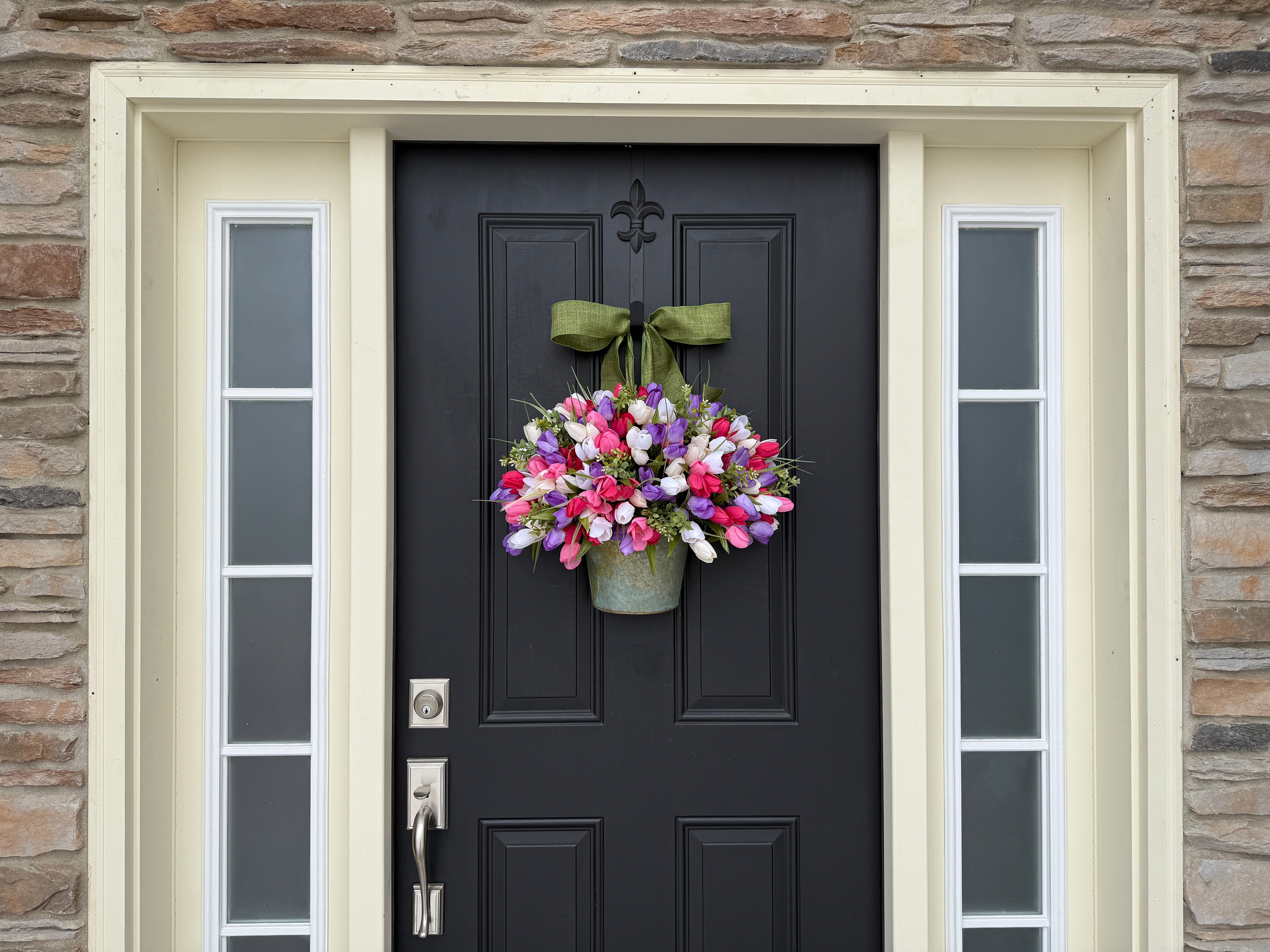 Welcome spring with the Spring Tulip Bouquet for Front Door. This stunning arrangement features vibrant pink, purple and white tulips and lush boxwood, creating a bright, cheerful touch for your entryway. Perfect for celebrating the season, it adds natural beauty and elegance to any front door or indoor space.