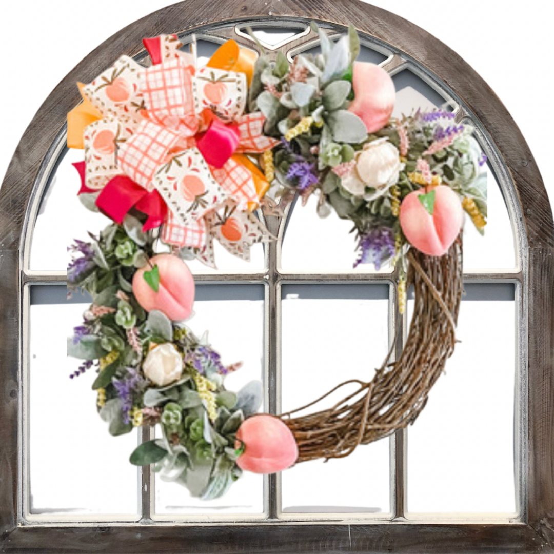 This peach wreath is created with bushels of faux lambs ear, frosted eucalyptus, faux lavender, peaches and peonies. This wreath measures approximately 21” in diameter measuring from the two widest points of the wreath.