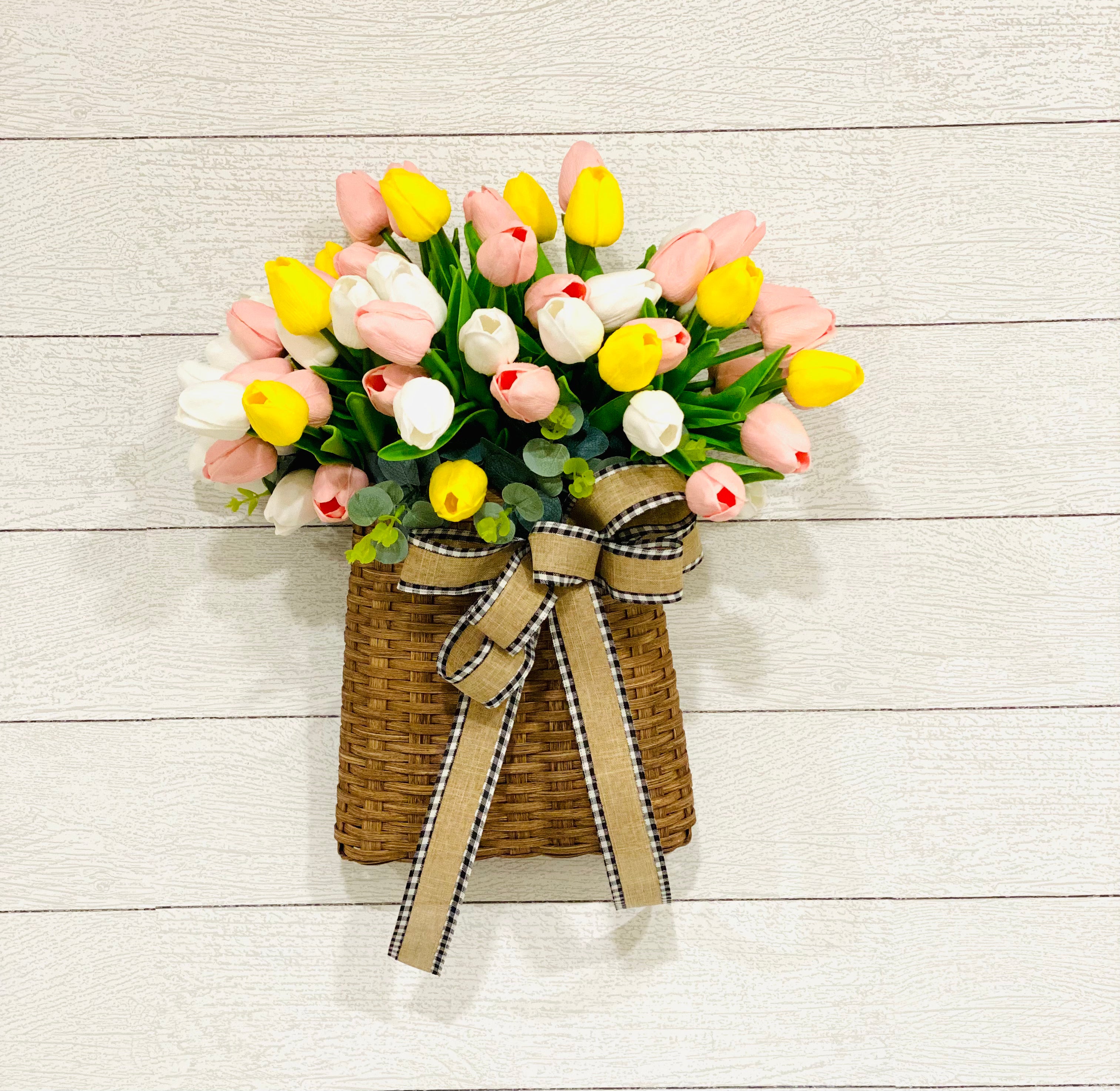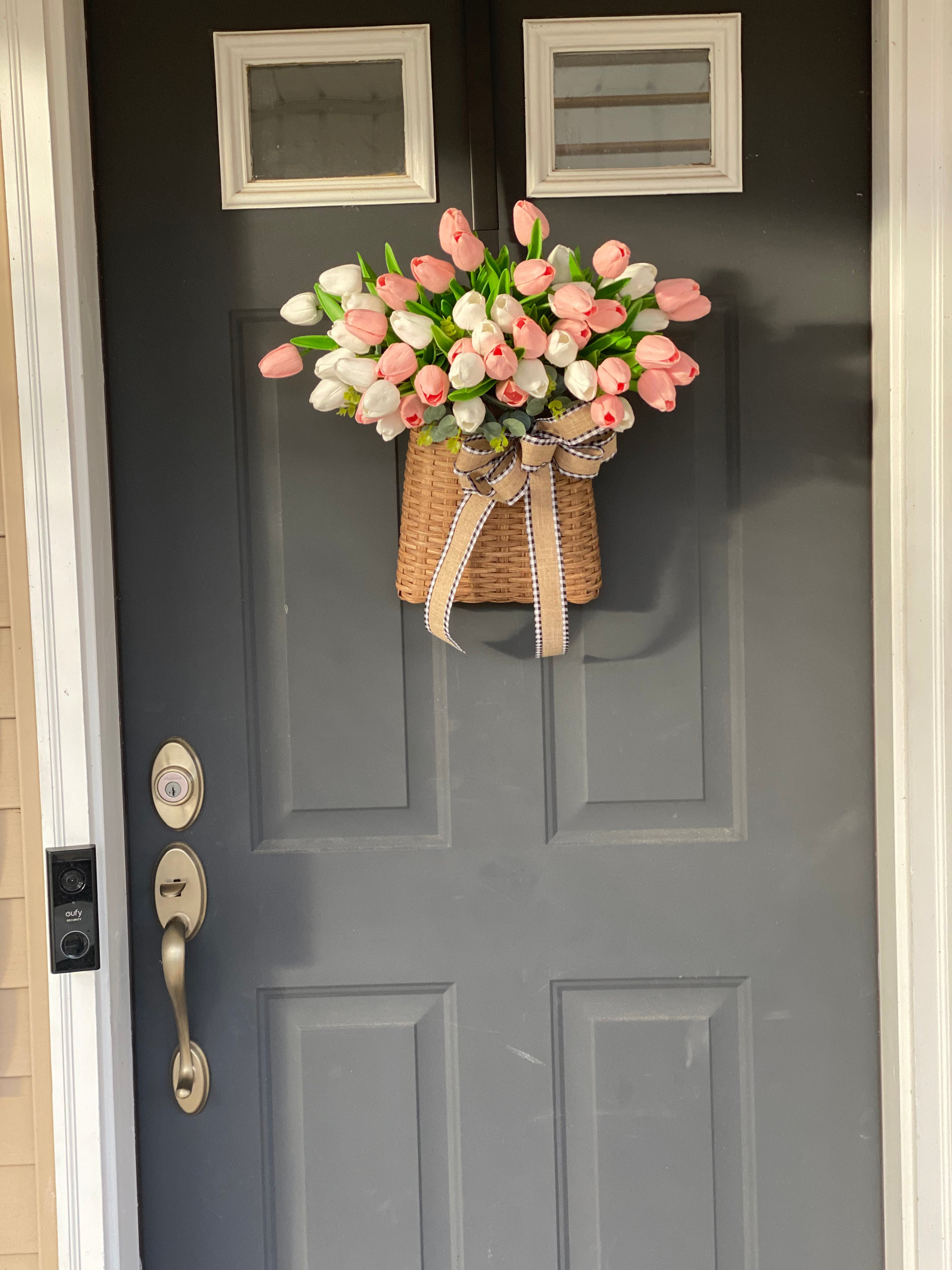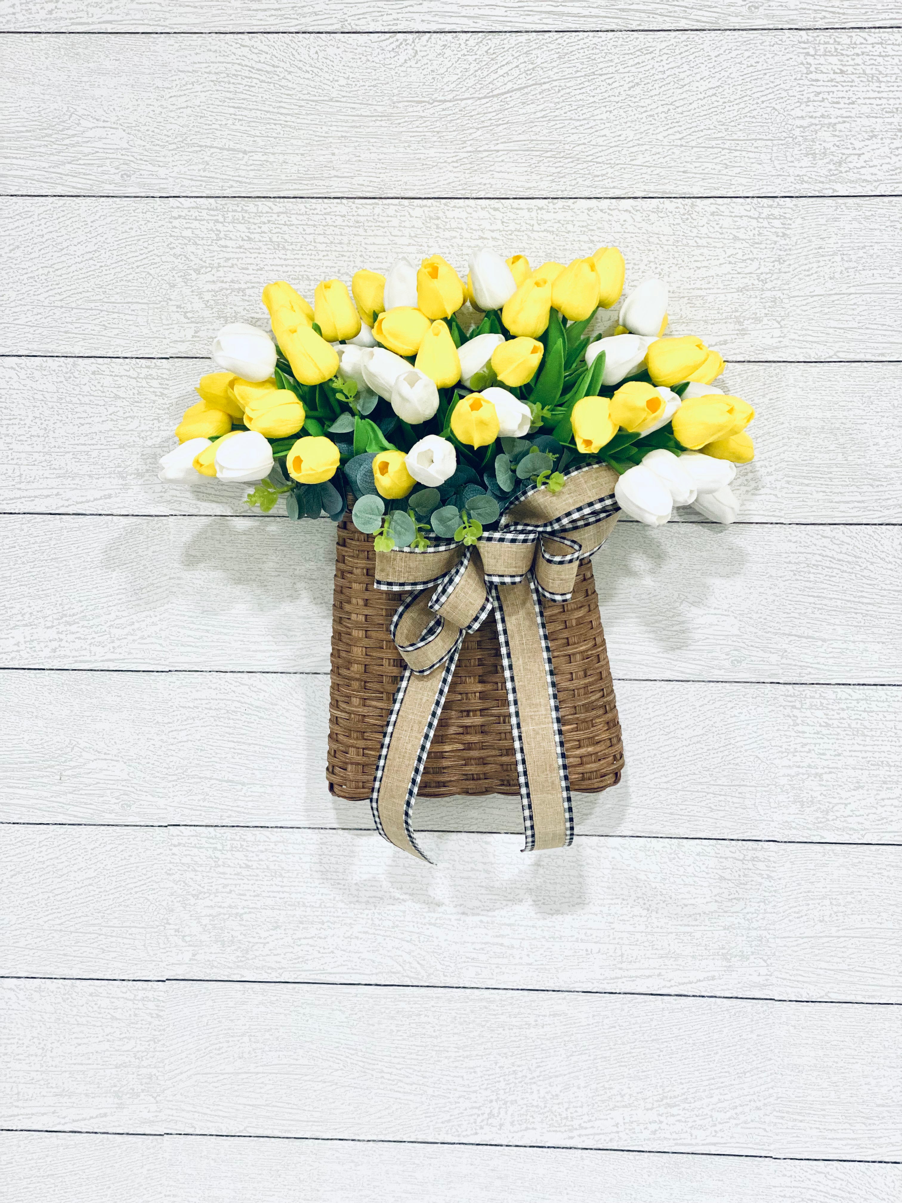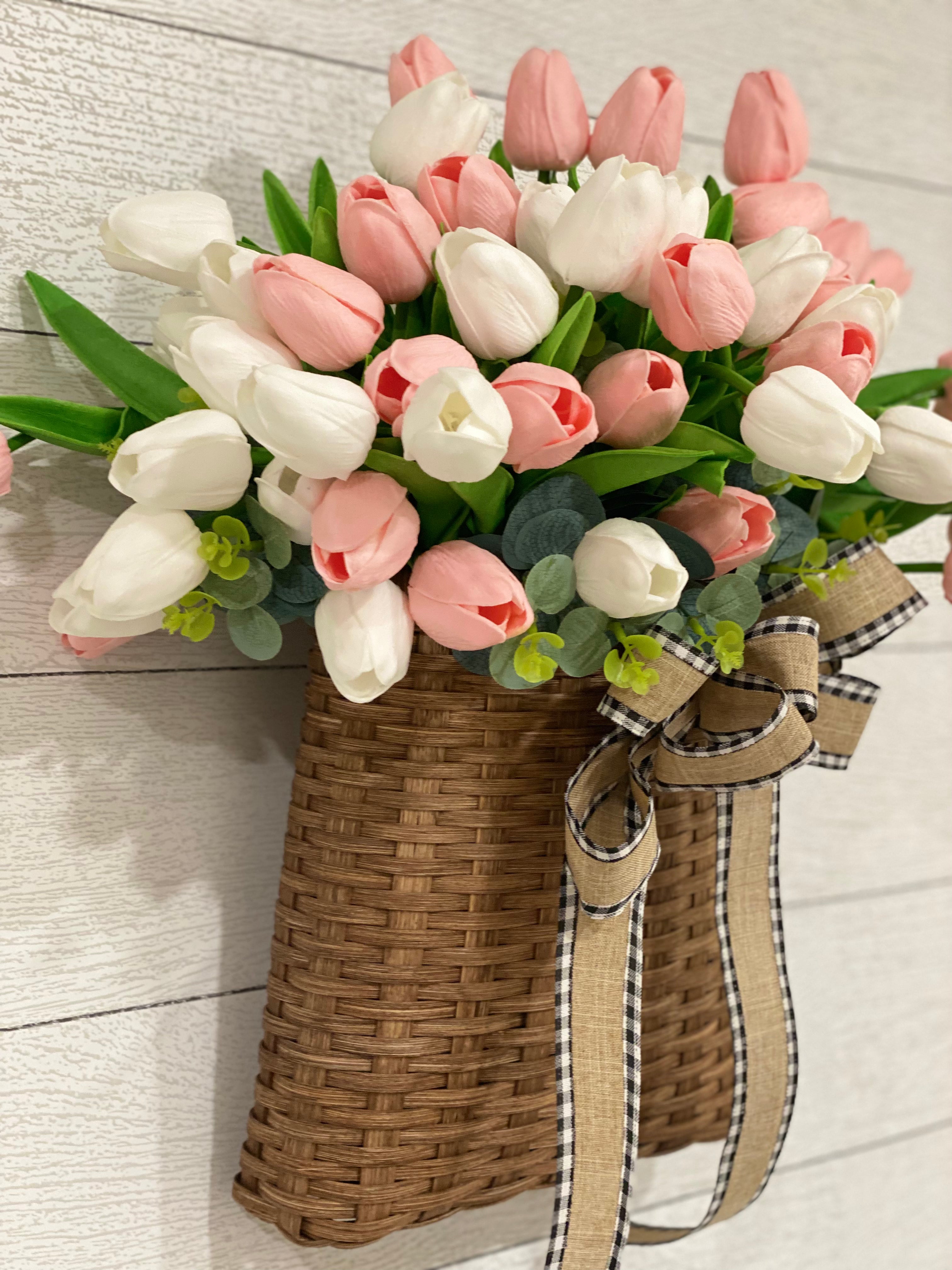 • Tulip Door Basket, Summer and Spring Door Hanger, Valentines Day Wall Decor, Farmhouse Tulip Wreath, French Country, Unique Gift for Mom