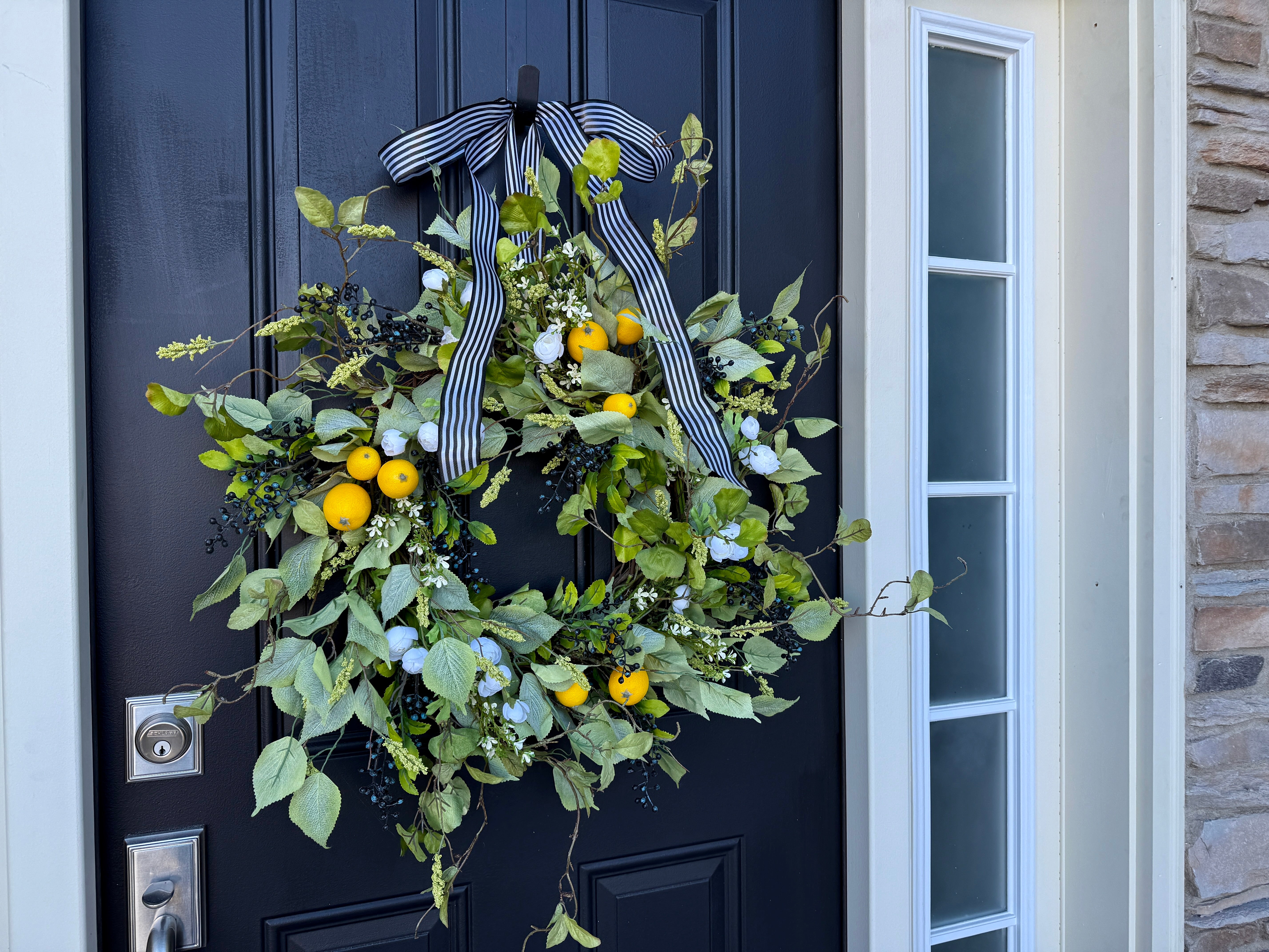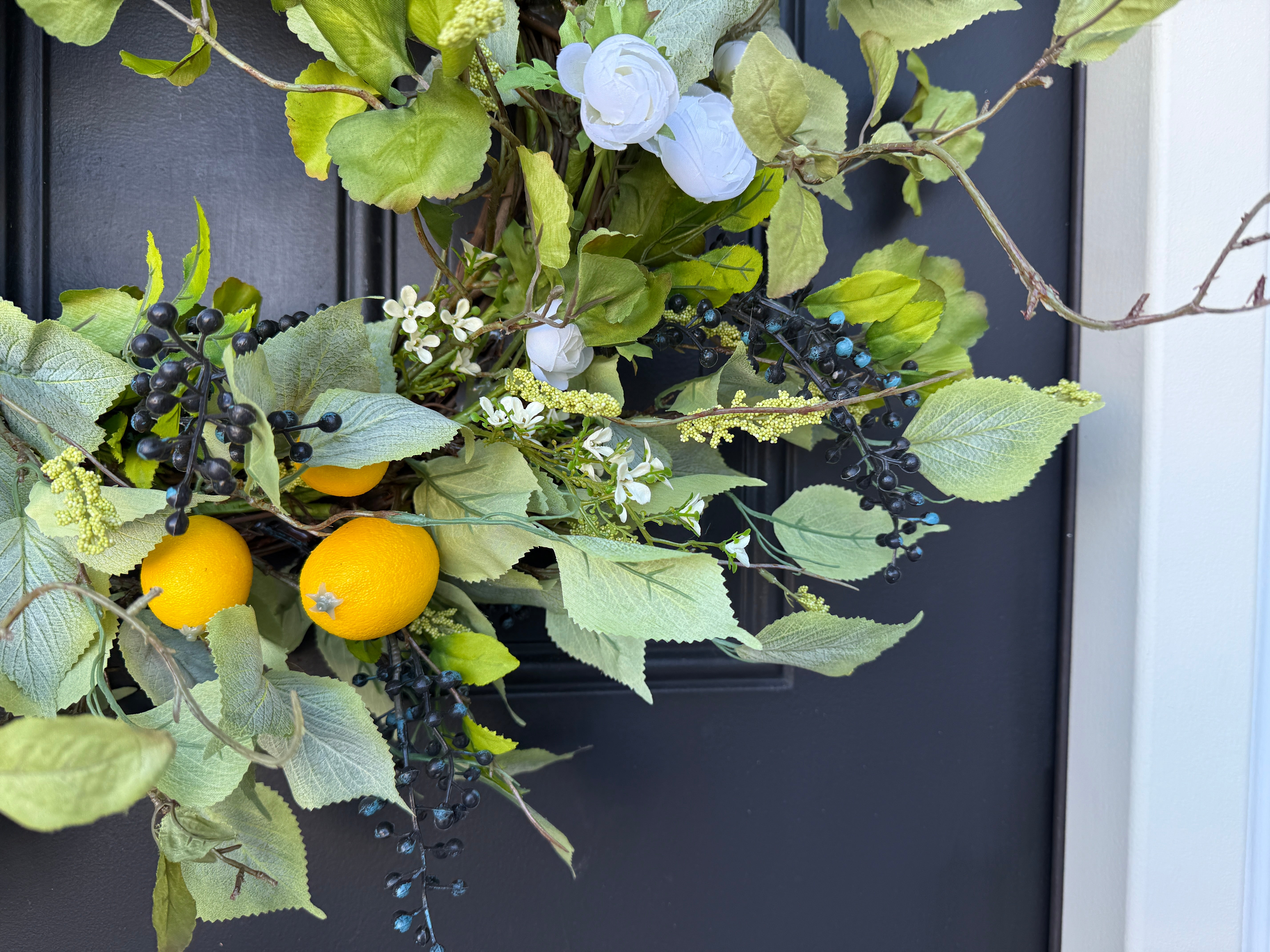 Brighten up your home with our refreshing Spring and Summer Lemon Wreath with white ranunculus and blueberry! Twoinspireyou is committed to crafting exquisite, one-of-a-kind spring and summer wreaths for you to enjoy season after season, year after year. We are your one-stop shop for the best in front door wreaths for every season and every reason!