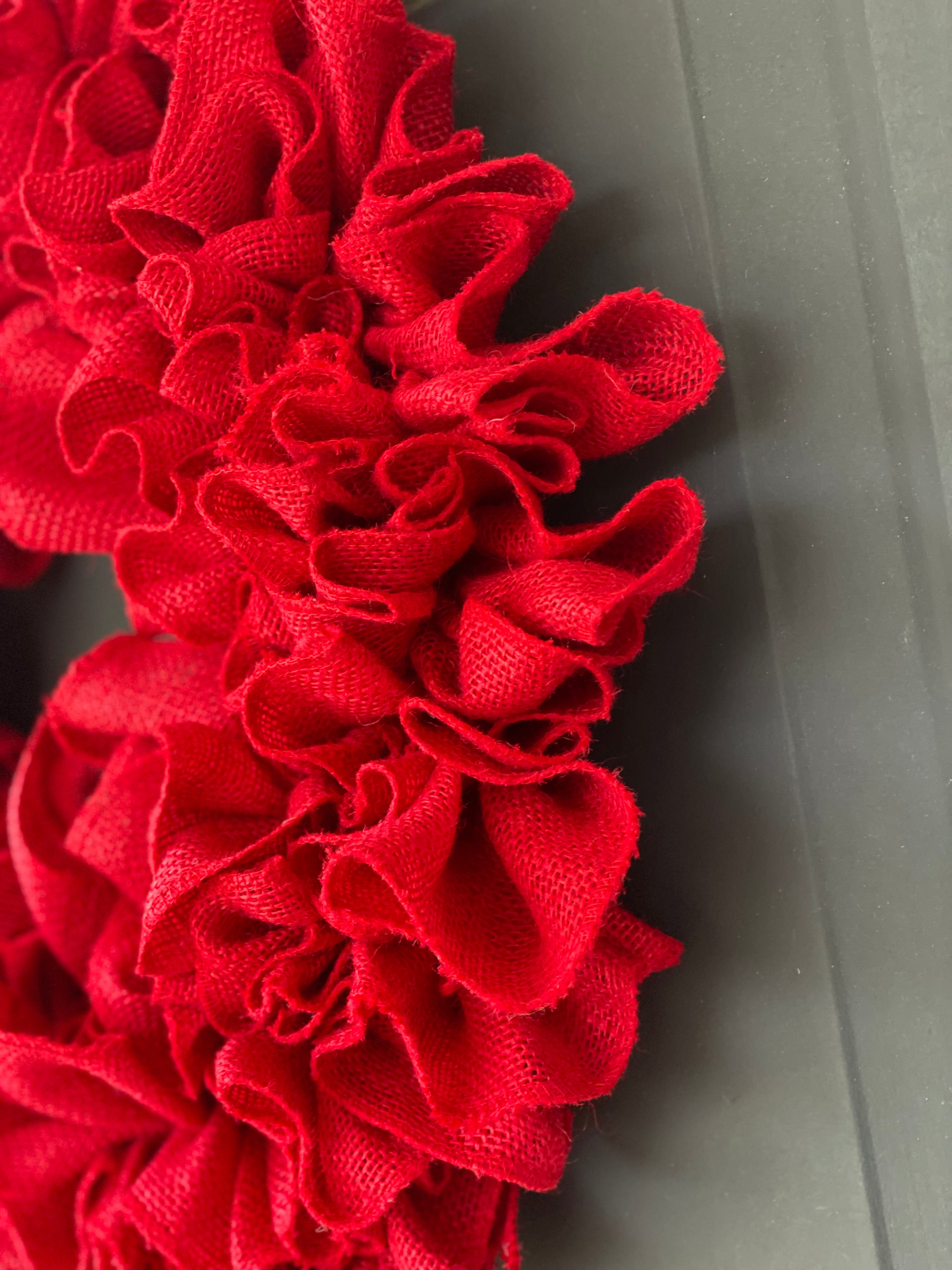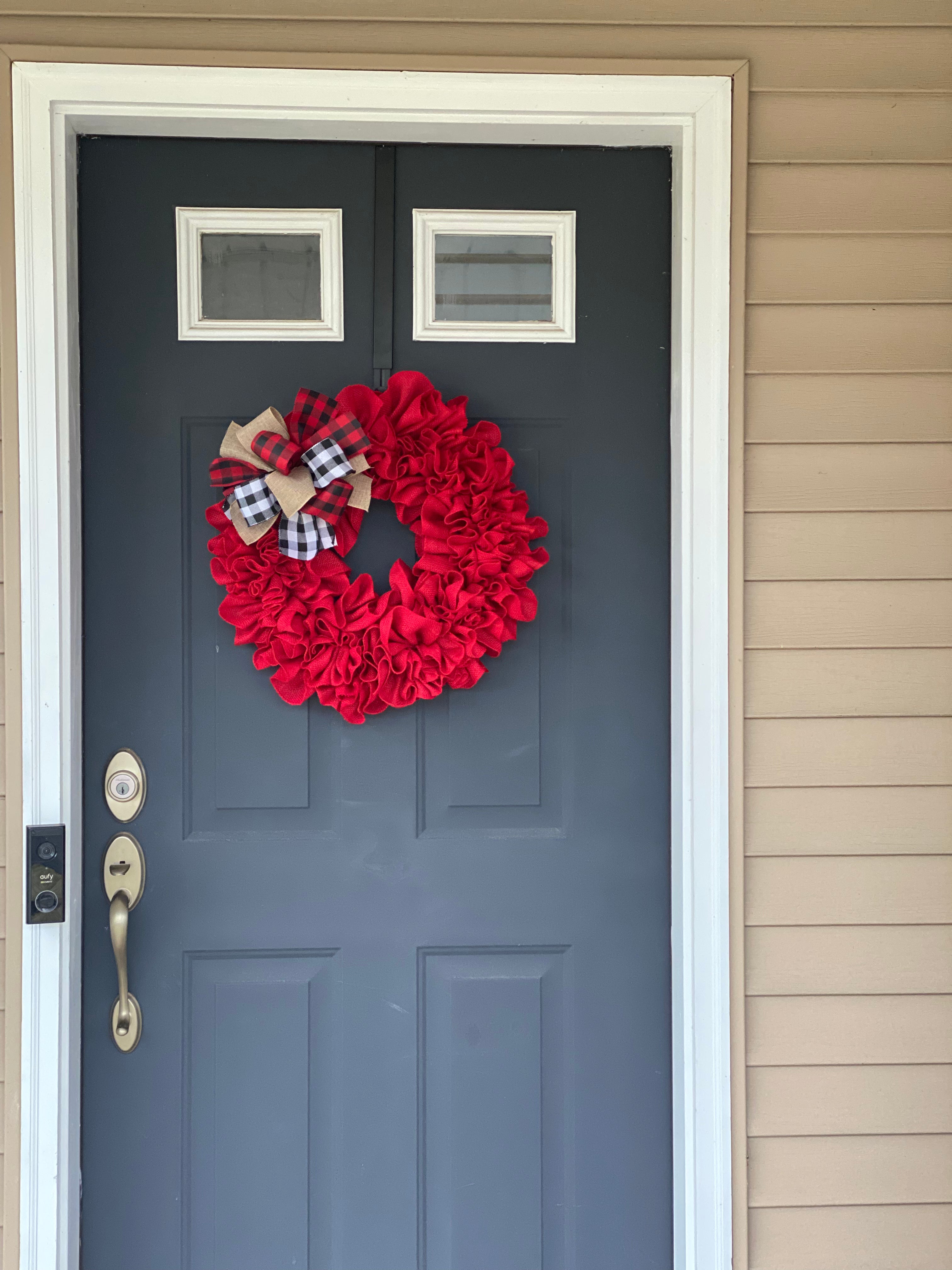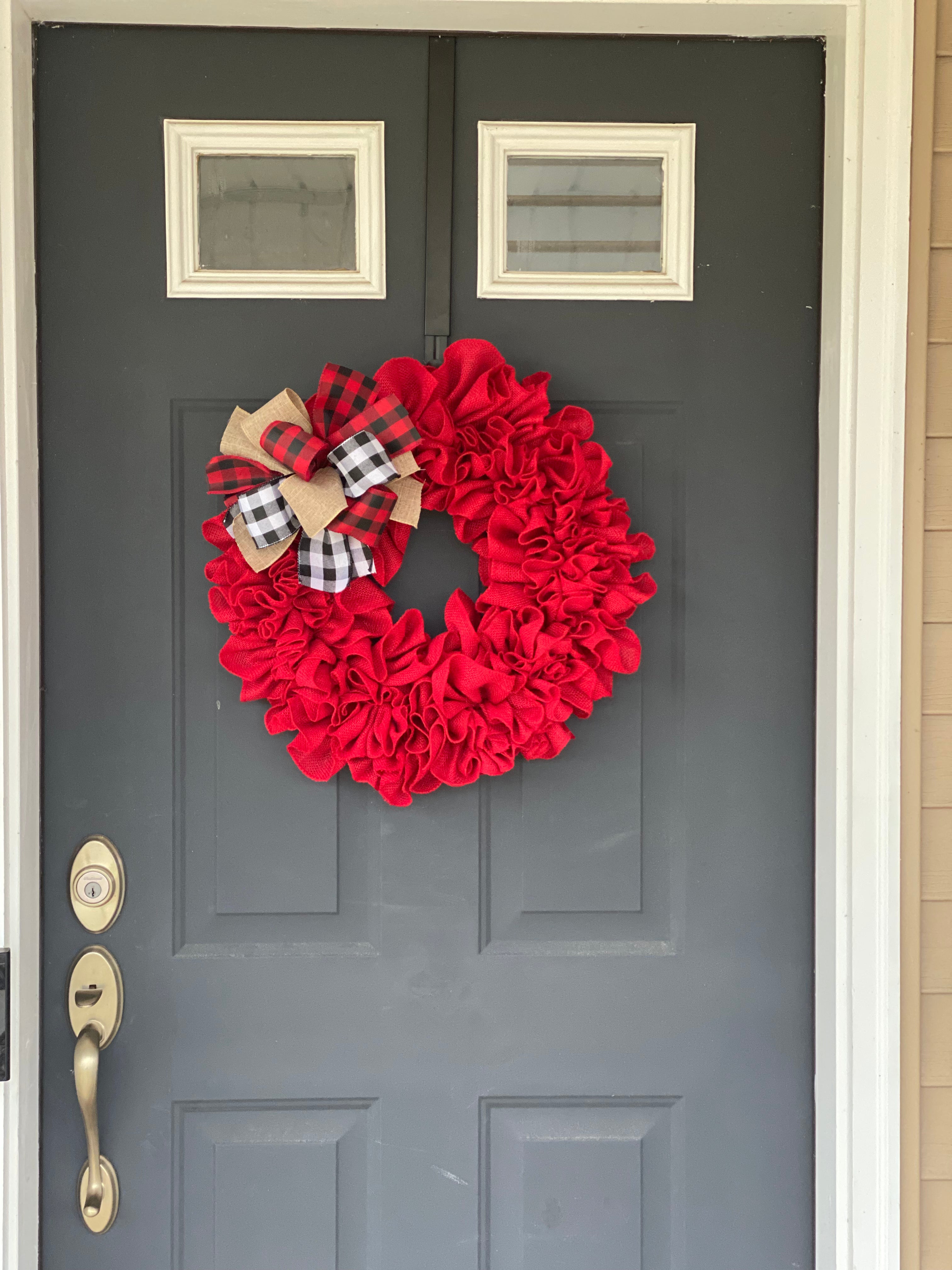 This Burlap Valentines Day Door Wreath made of quality red burlap heart and a Buffalo plaid bow will add that sought after a pop of color your to your front door.