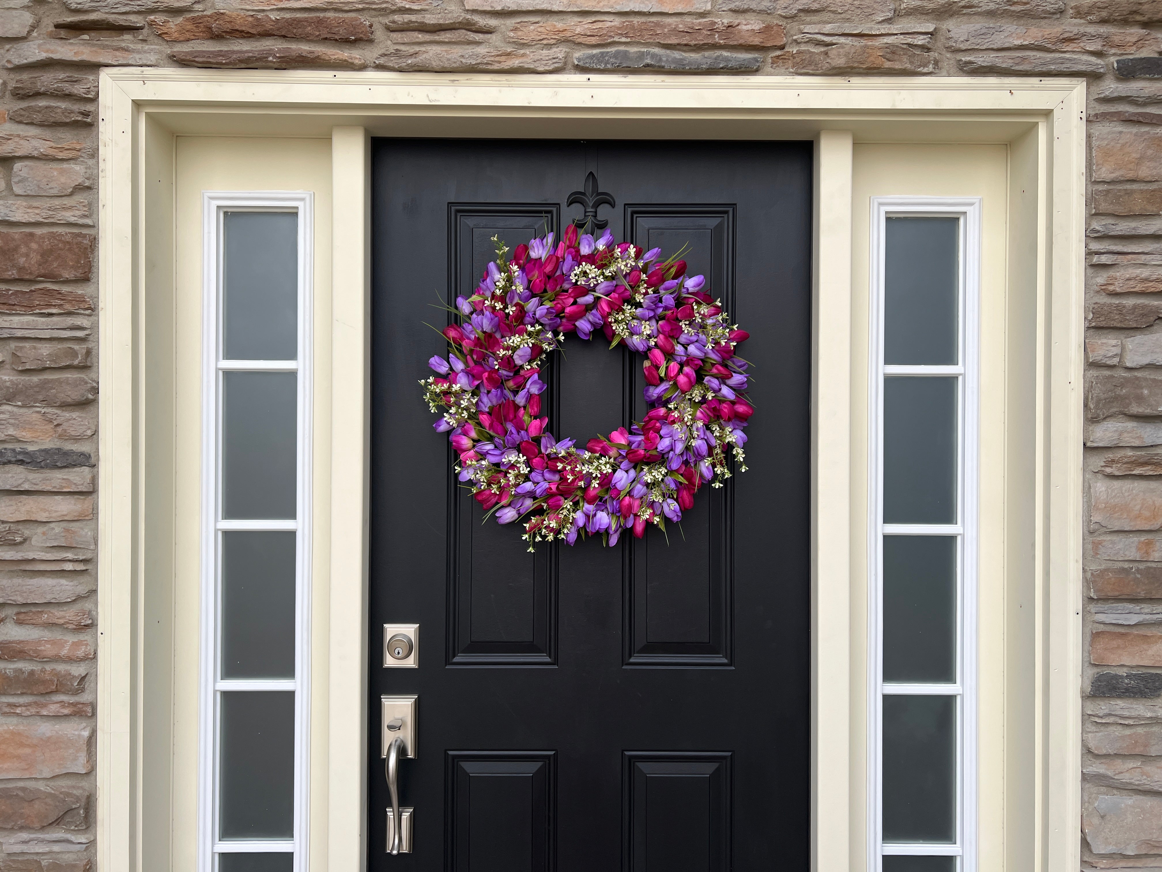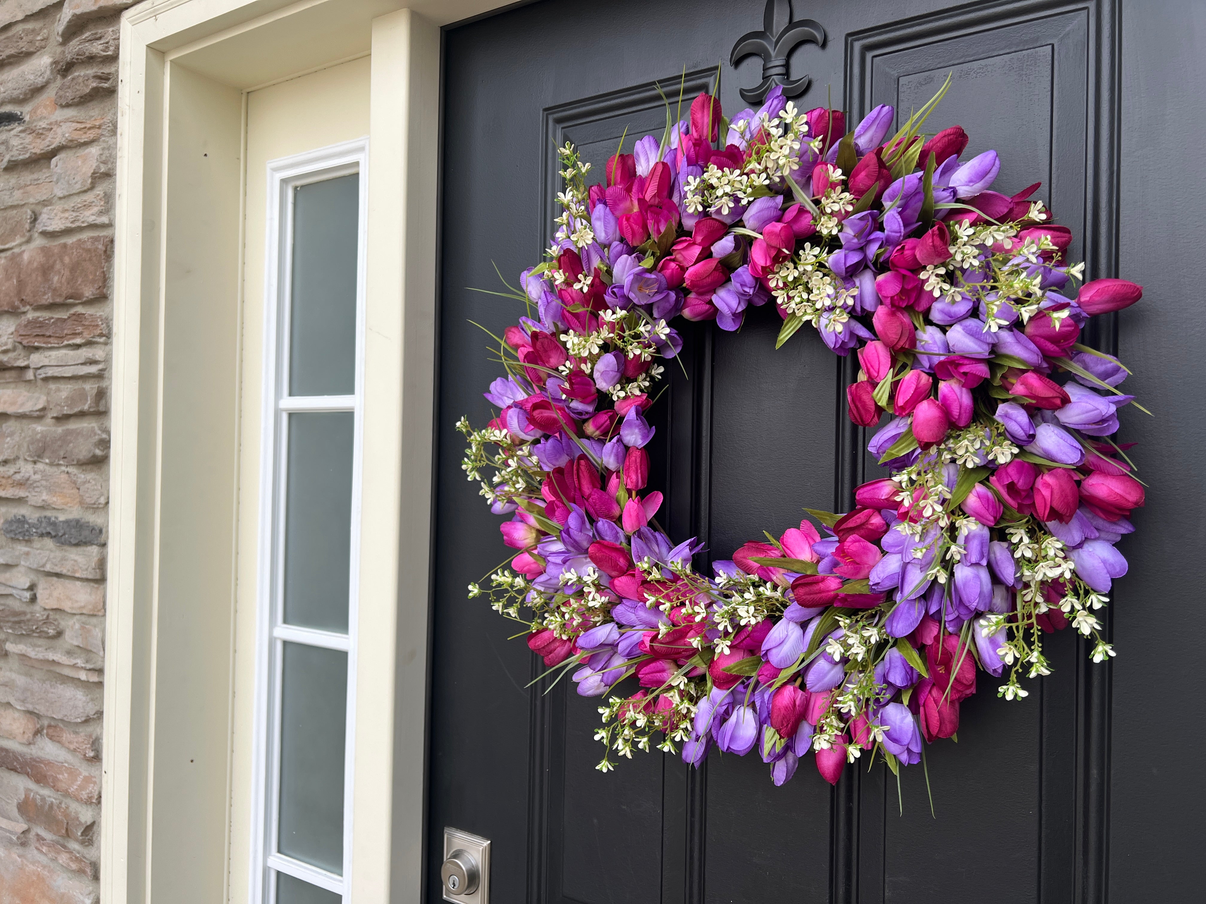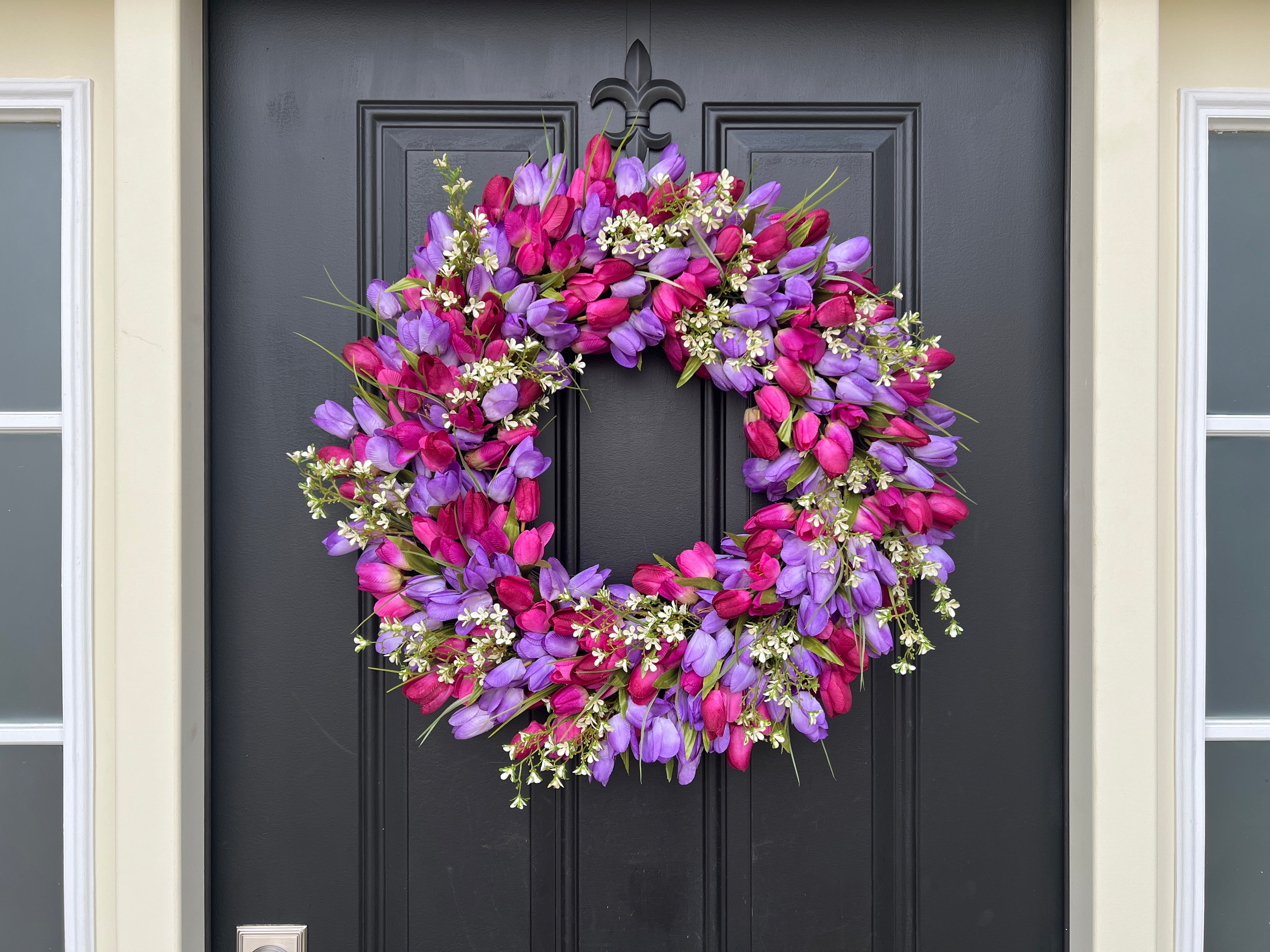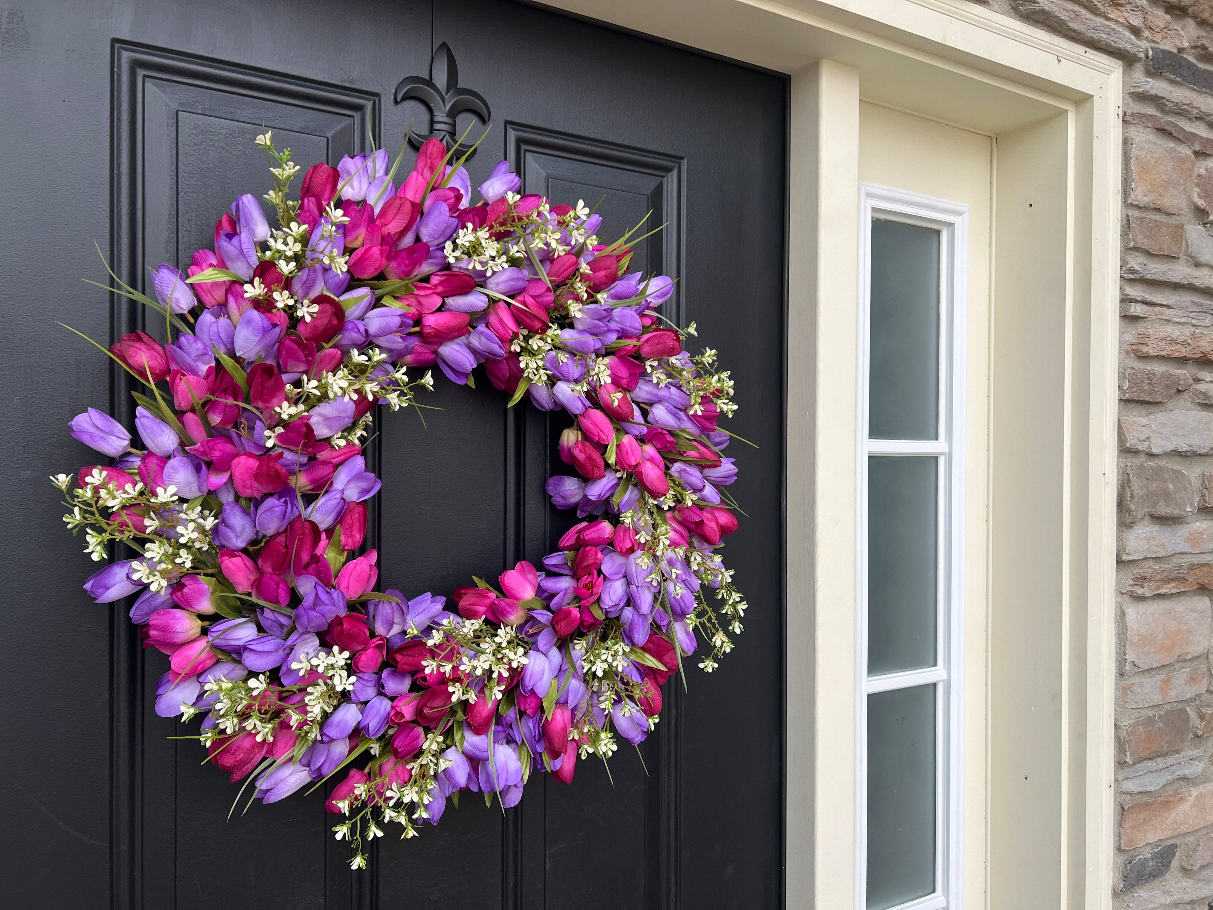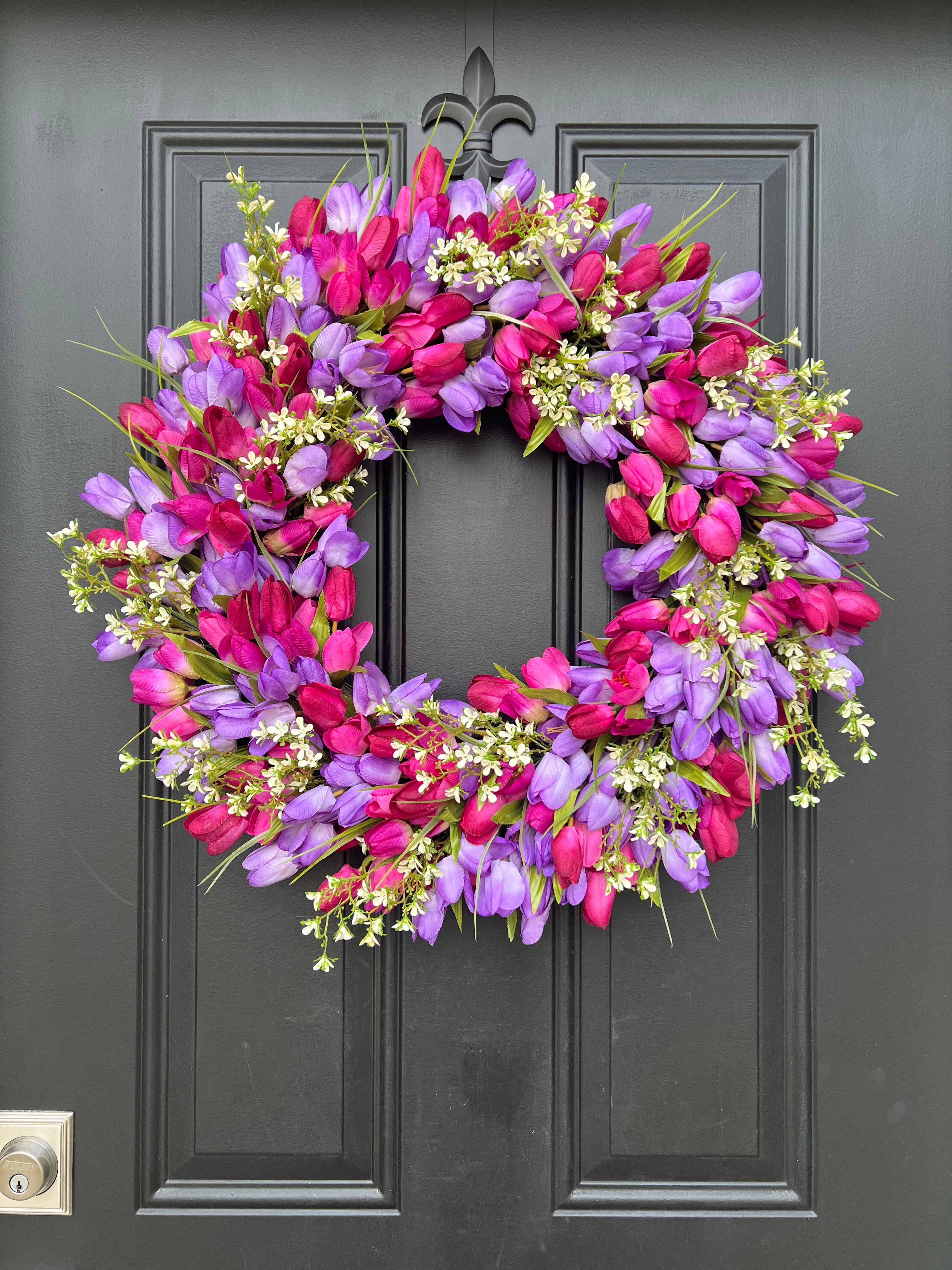 Celebrate spring with our 24' Vibrant Spring Tulip Wreath, featuring purple blended tulips and delicate white flowers. Perfect for Easter and Mother's Day gifts, this cheerful wreath adds a fresh, vibrant touch to your home. Handcrafted with care, it's an elegant way to welcome the season and make a thoughtful gift for loved ones.