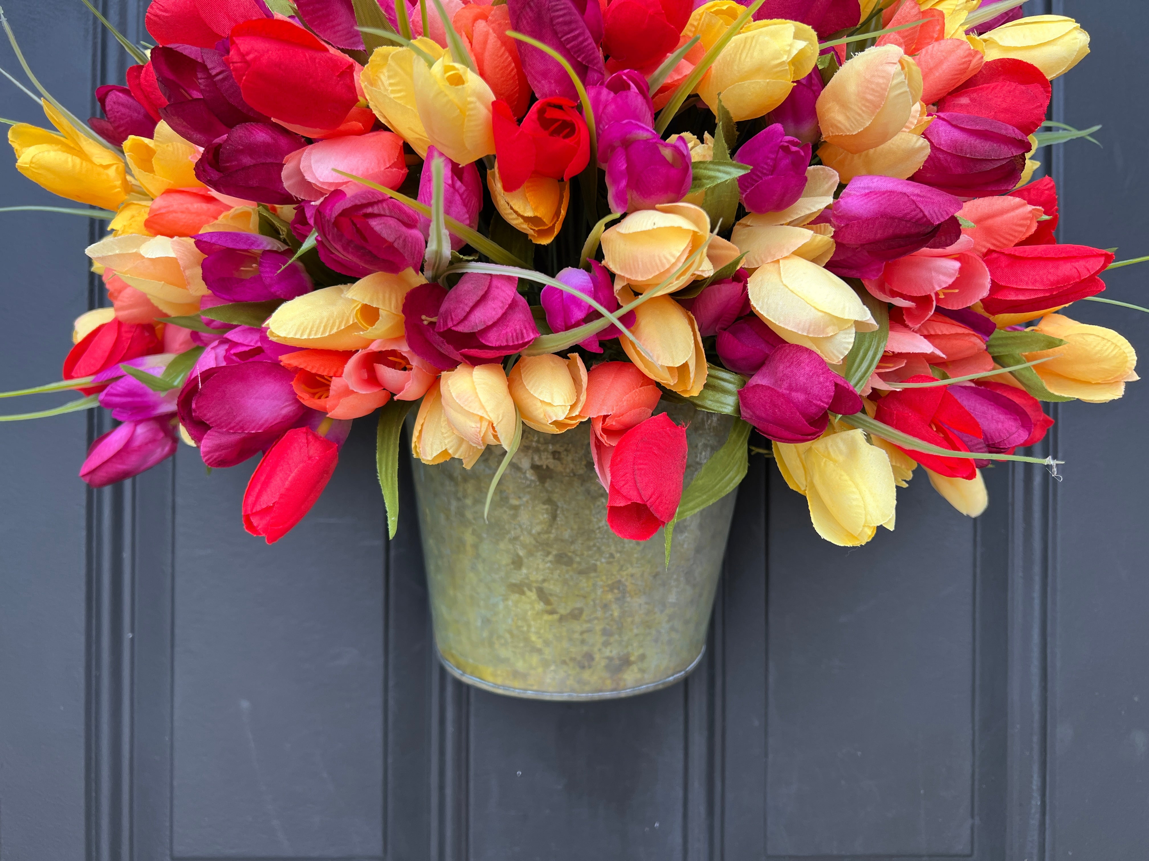 Vibrant Spring Tulips in Galvanized Bucket - Front Door Decor with Tulips