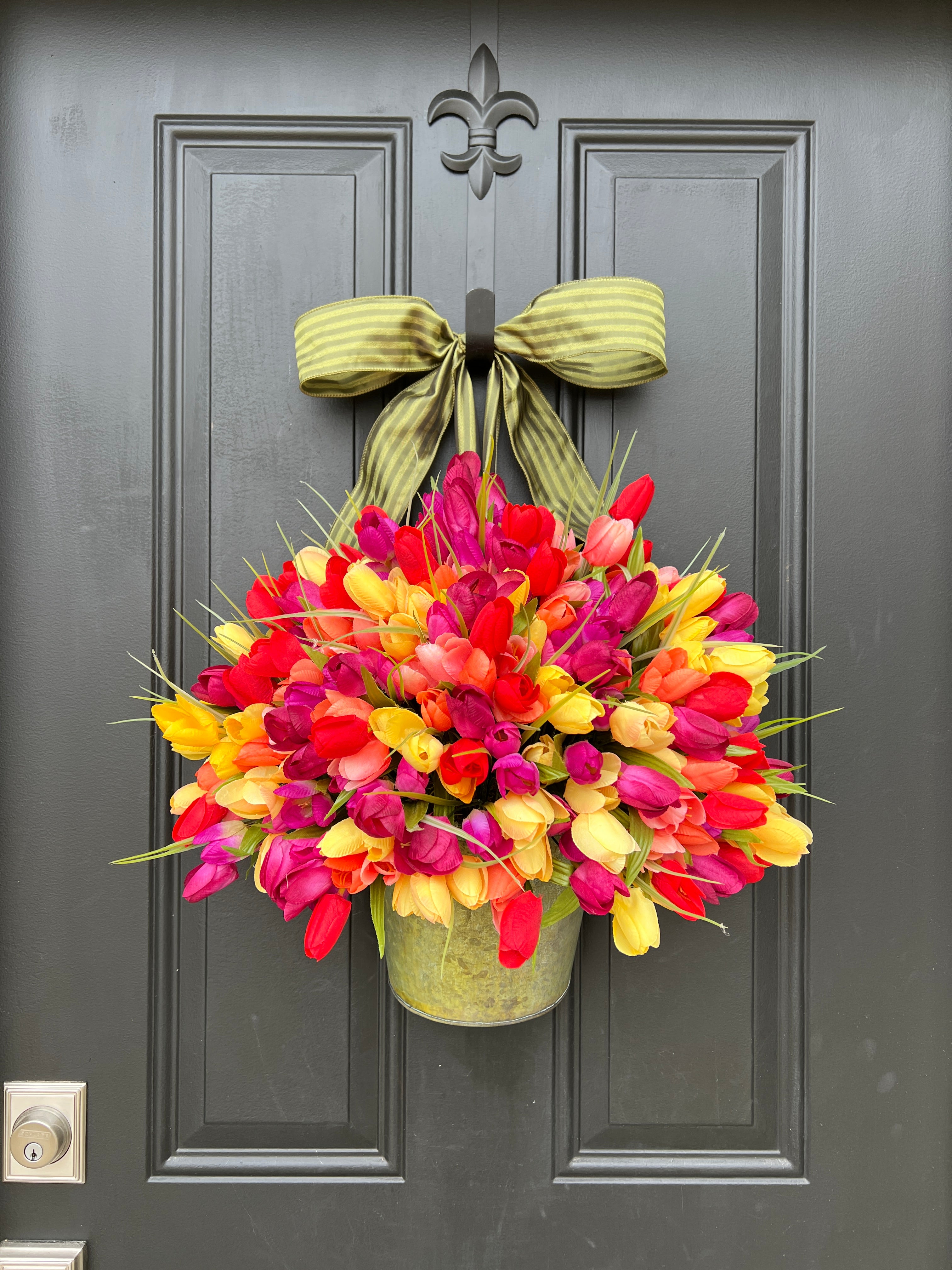 • Vibrant Spring Tulips in Galvanized Bucket - Front Door Decor with Tulips