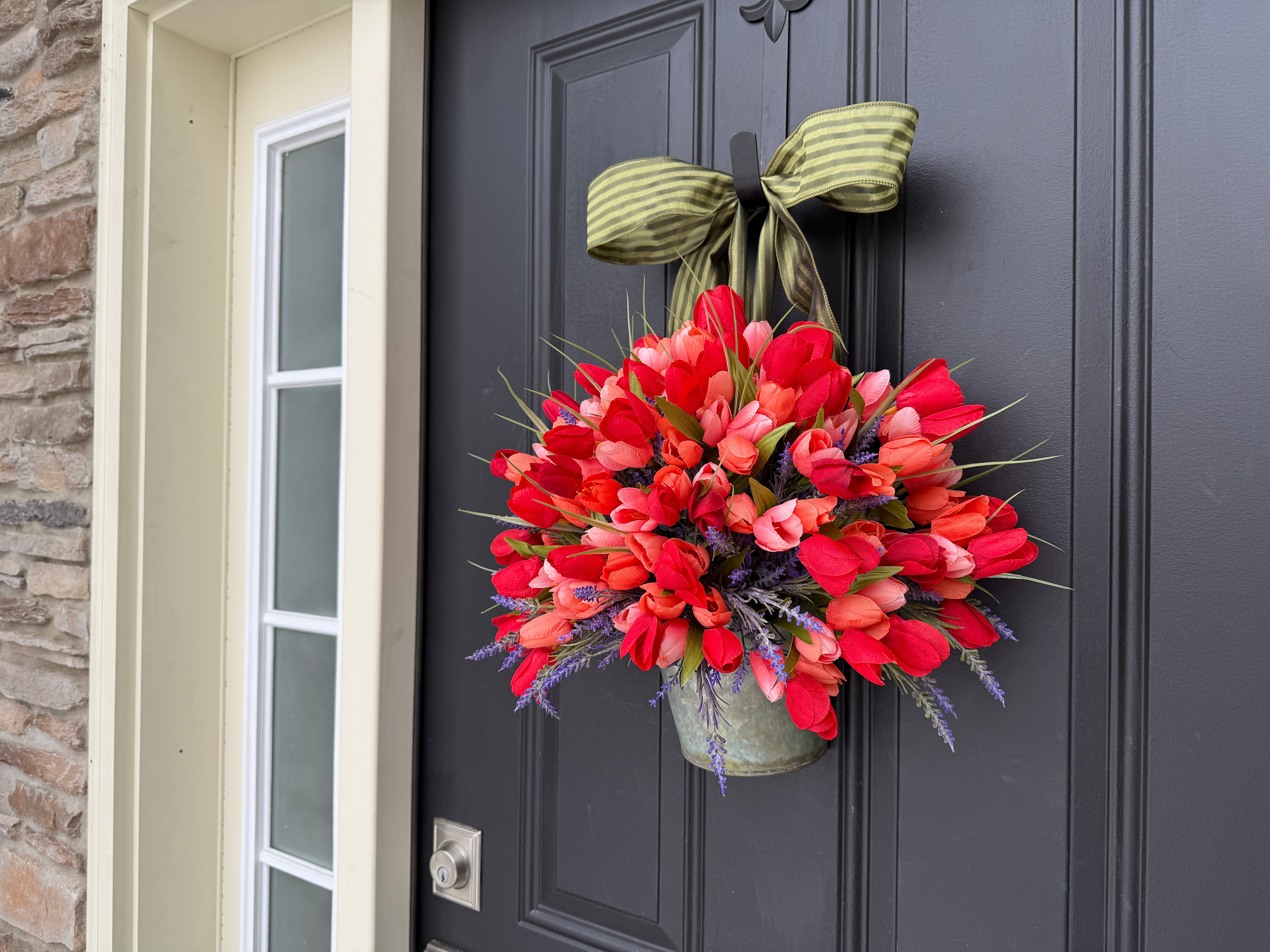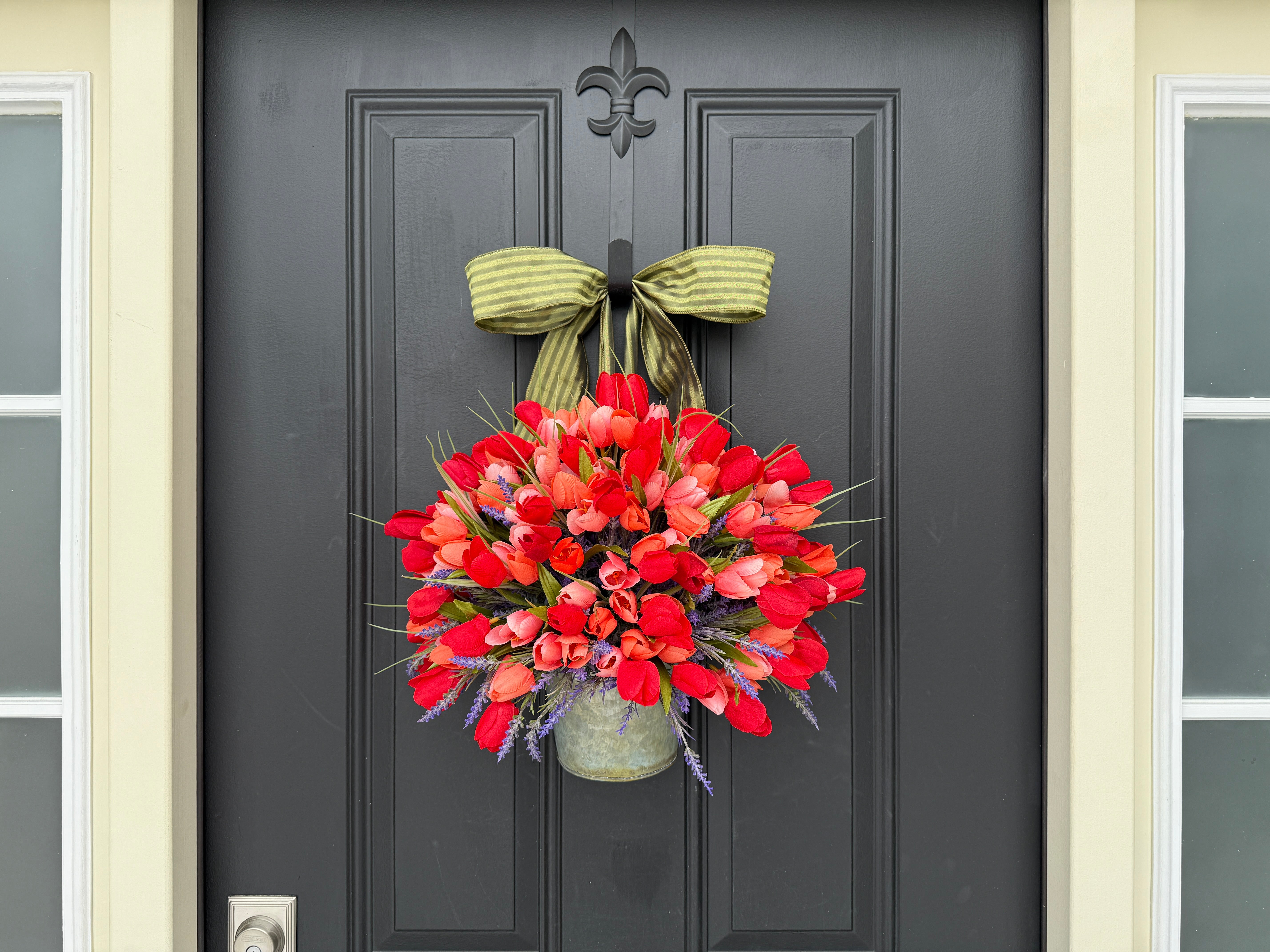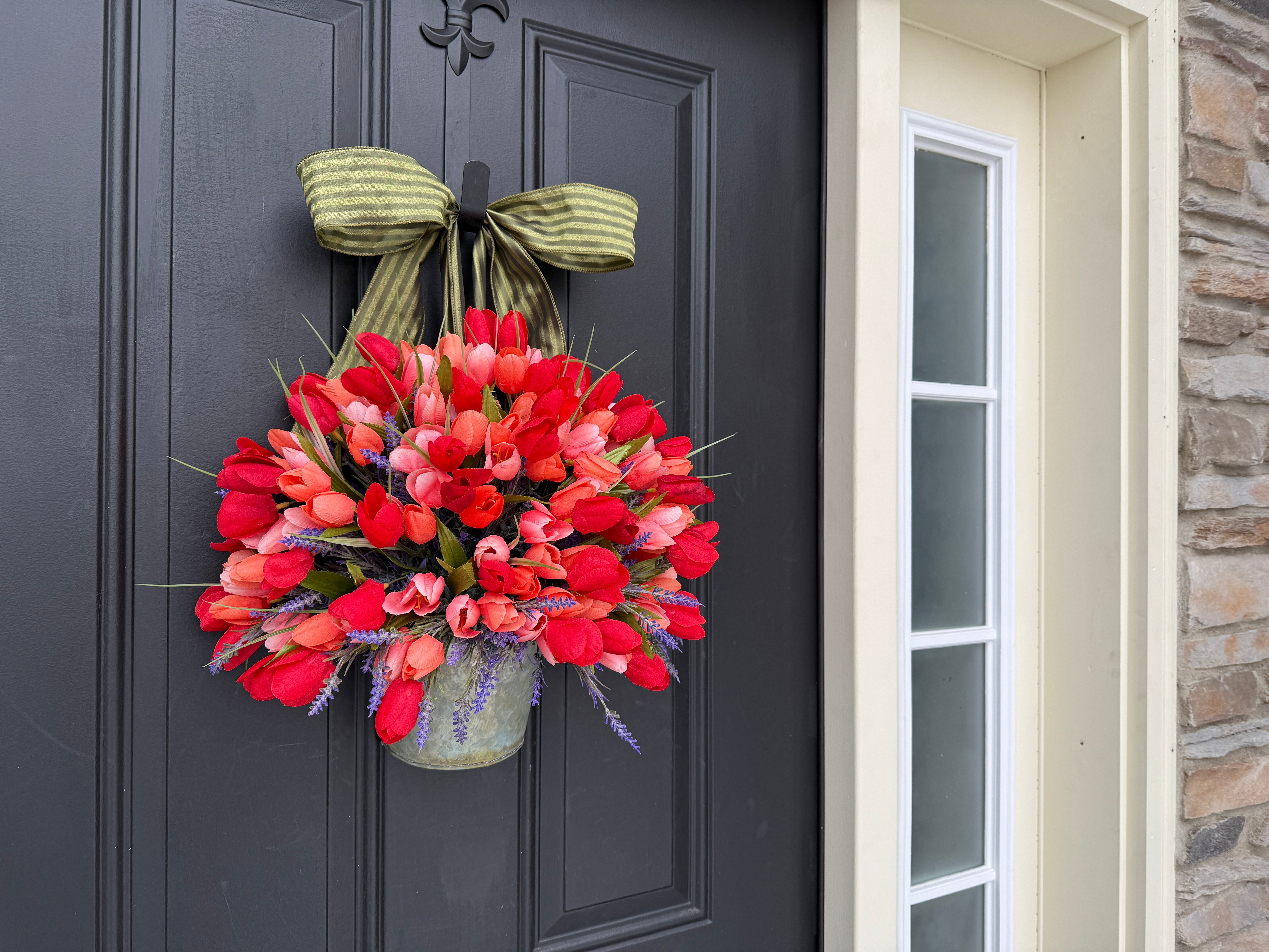 • Vibrant Tulip Bucket Wreath - Front Door Tulip Decor with Lavender
