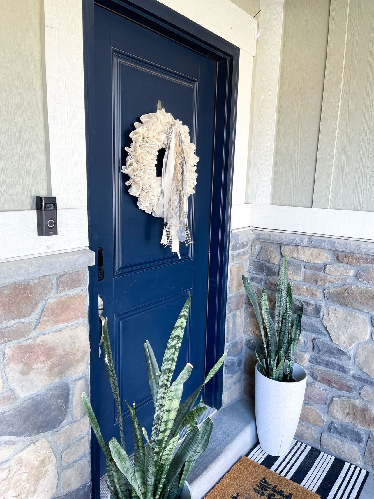 This wreath is made with quality ivory colored burlap on a 14” wreath frame.