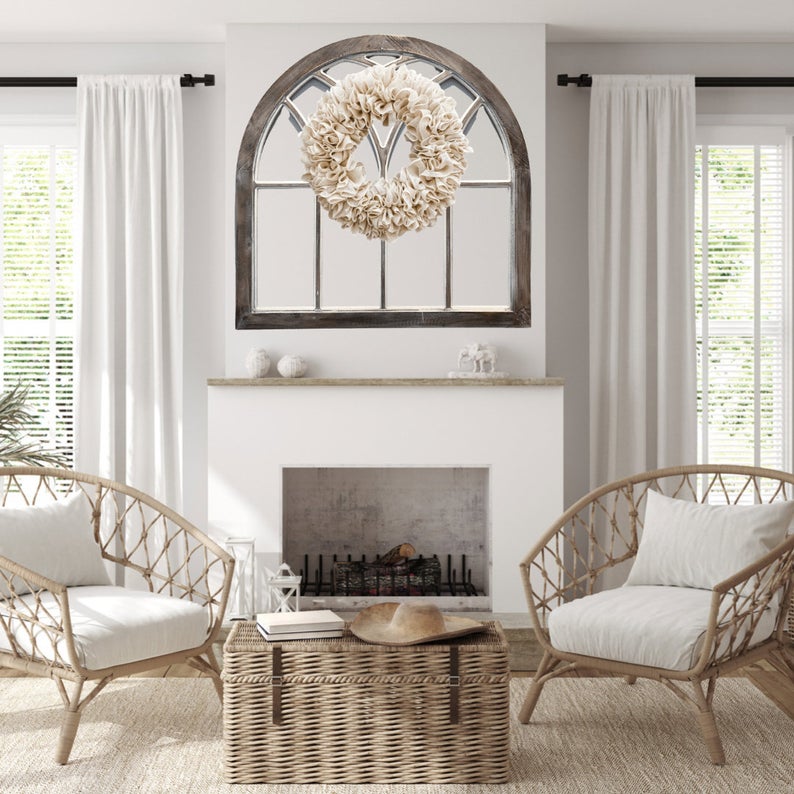 This Burlap wreath measures approximately 19” in diameter as a finished product. Use this burlap wreath as a front door wreath, wall decor, or as an accessory to add additional style to wall decor such as window shutters, mirror, or picture frame.