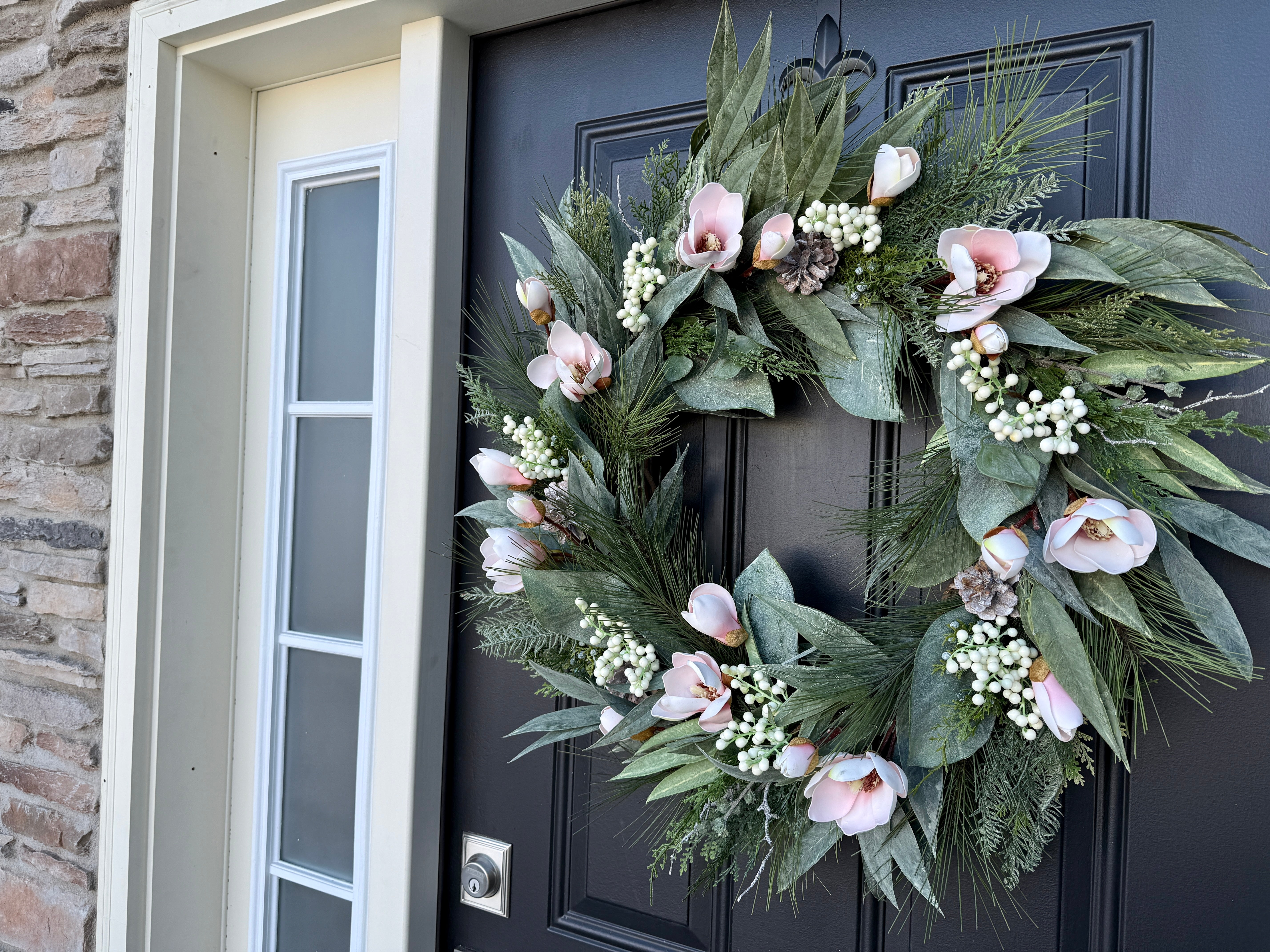 Winter Magnolia Wreath with Pink Magnolia Flowers