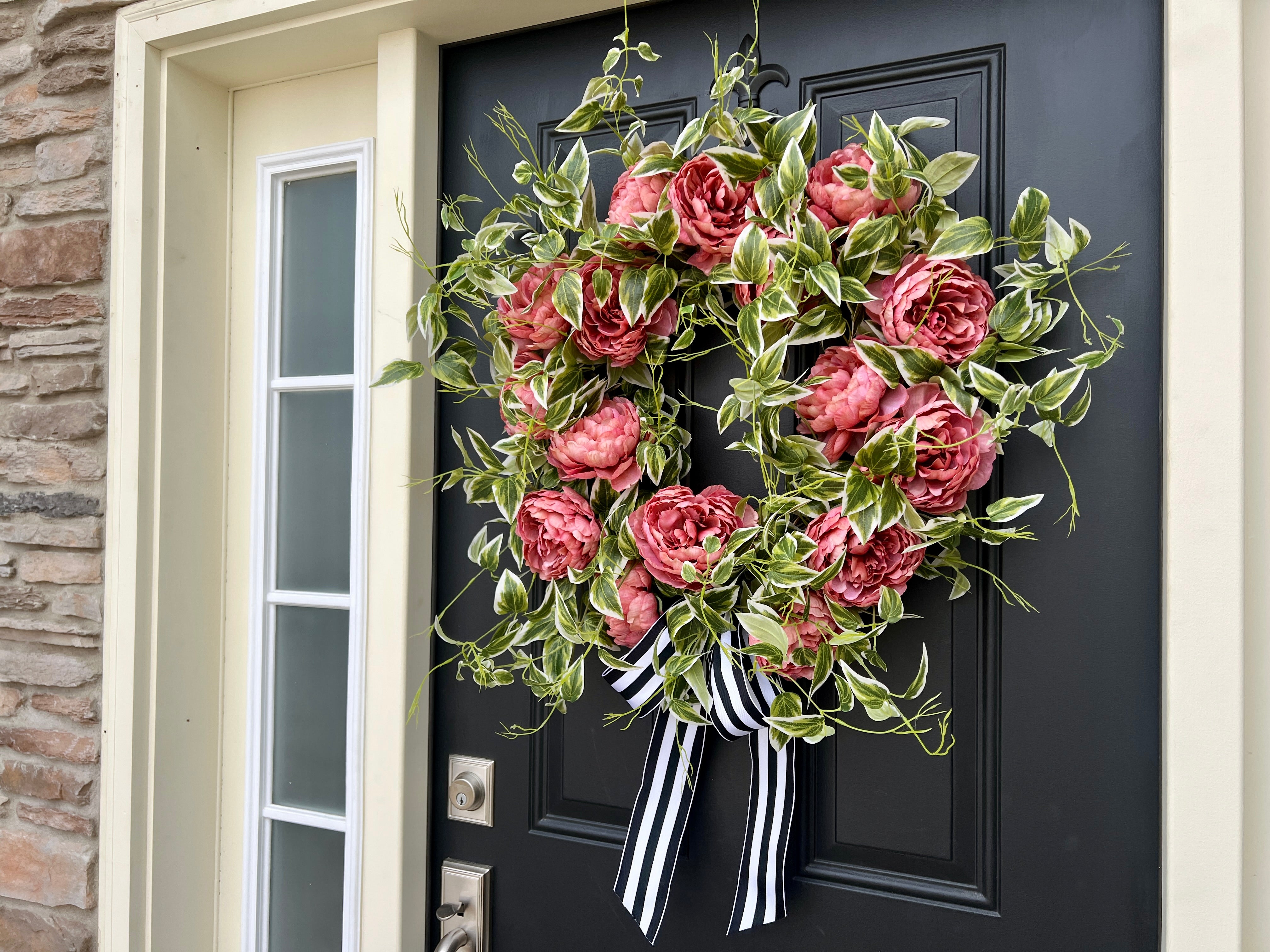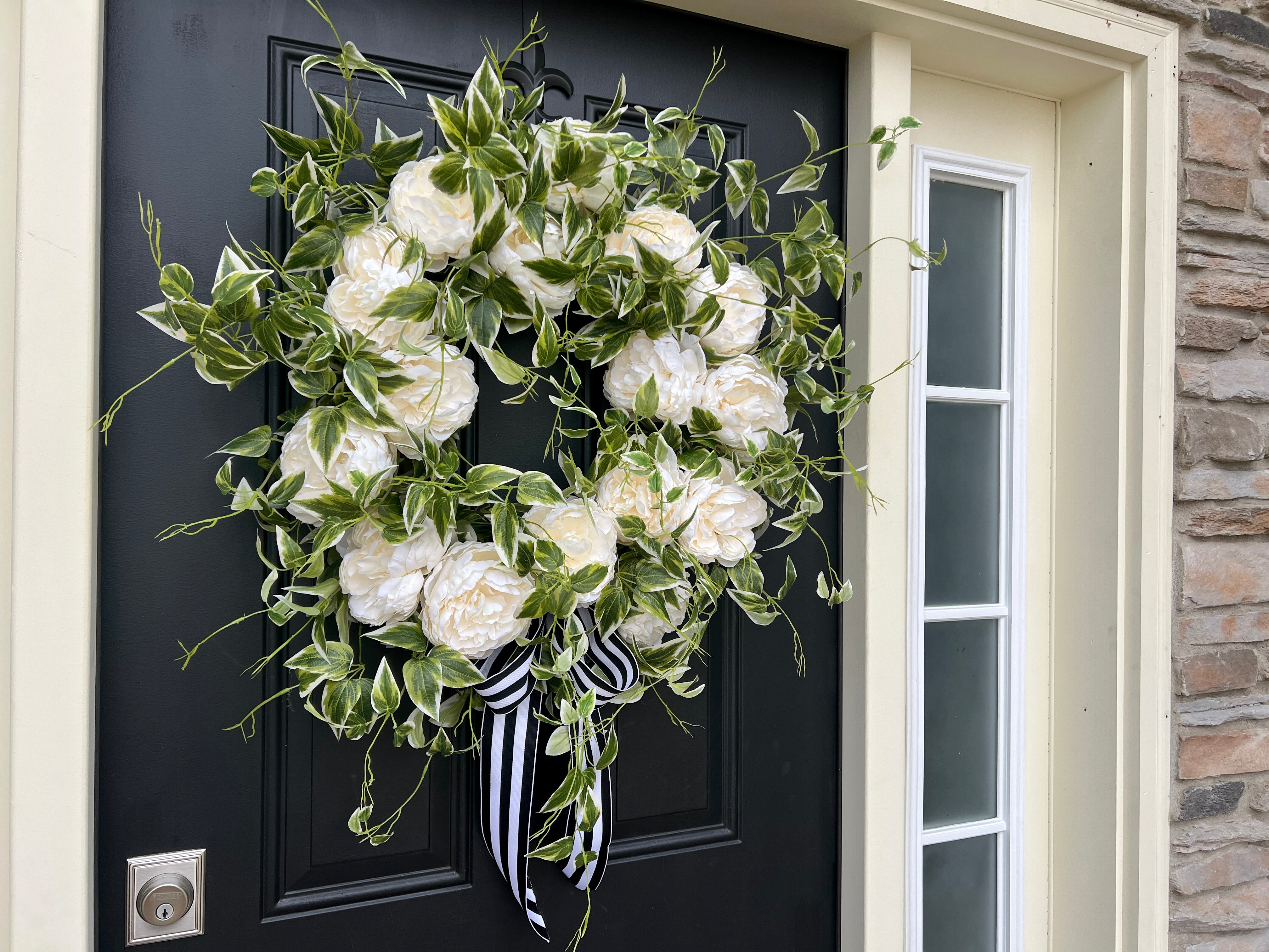 Spring Peony Wreath - White Peony Blooms & Hanging Variegated Ivy