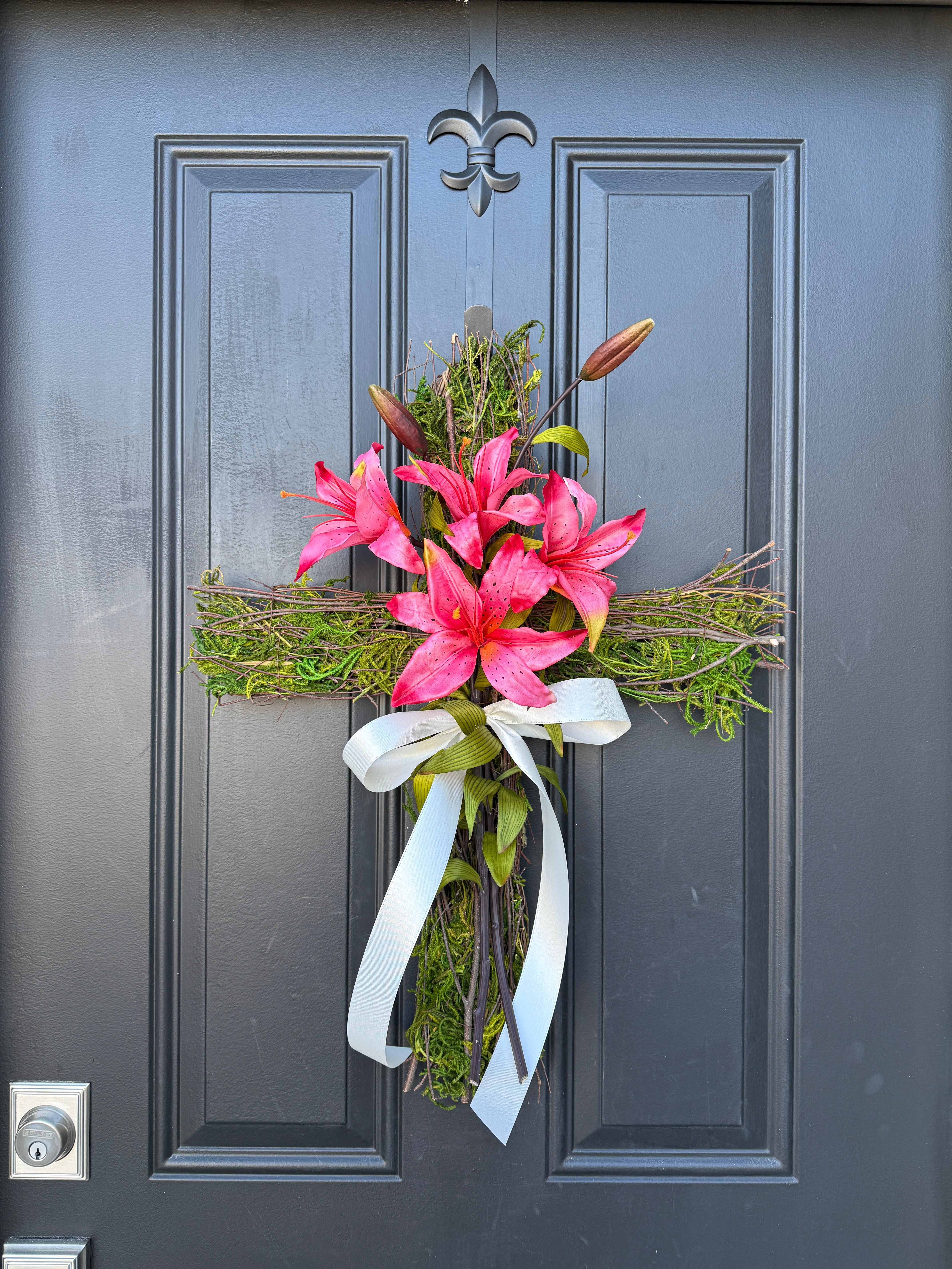 Lily Cross Wreath for Front Door - Pink Lilies for First Communion and Easter