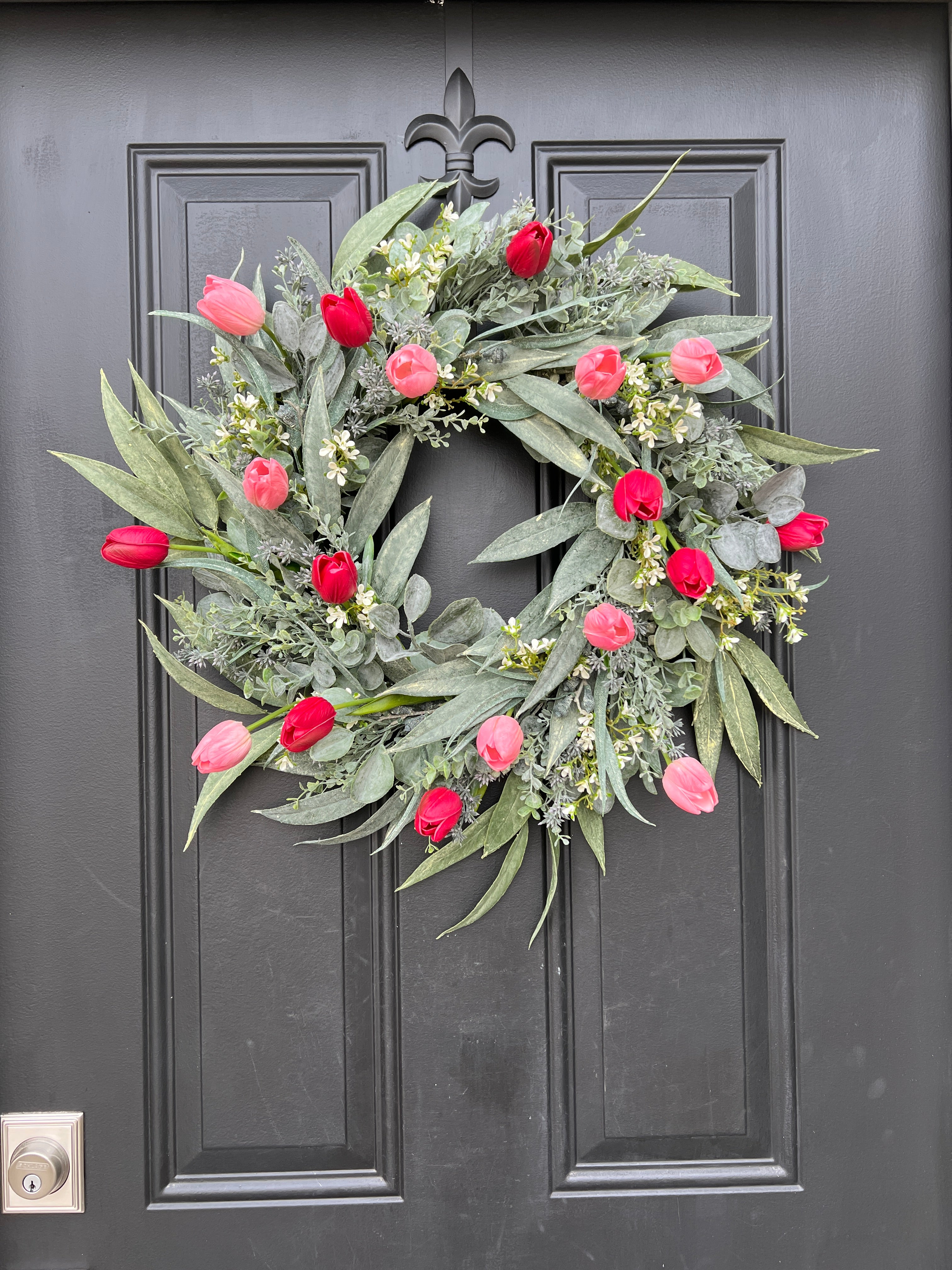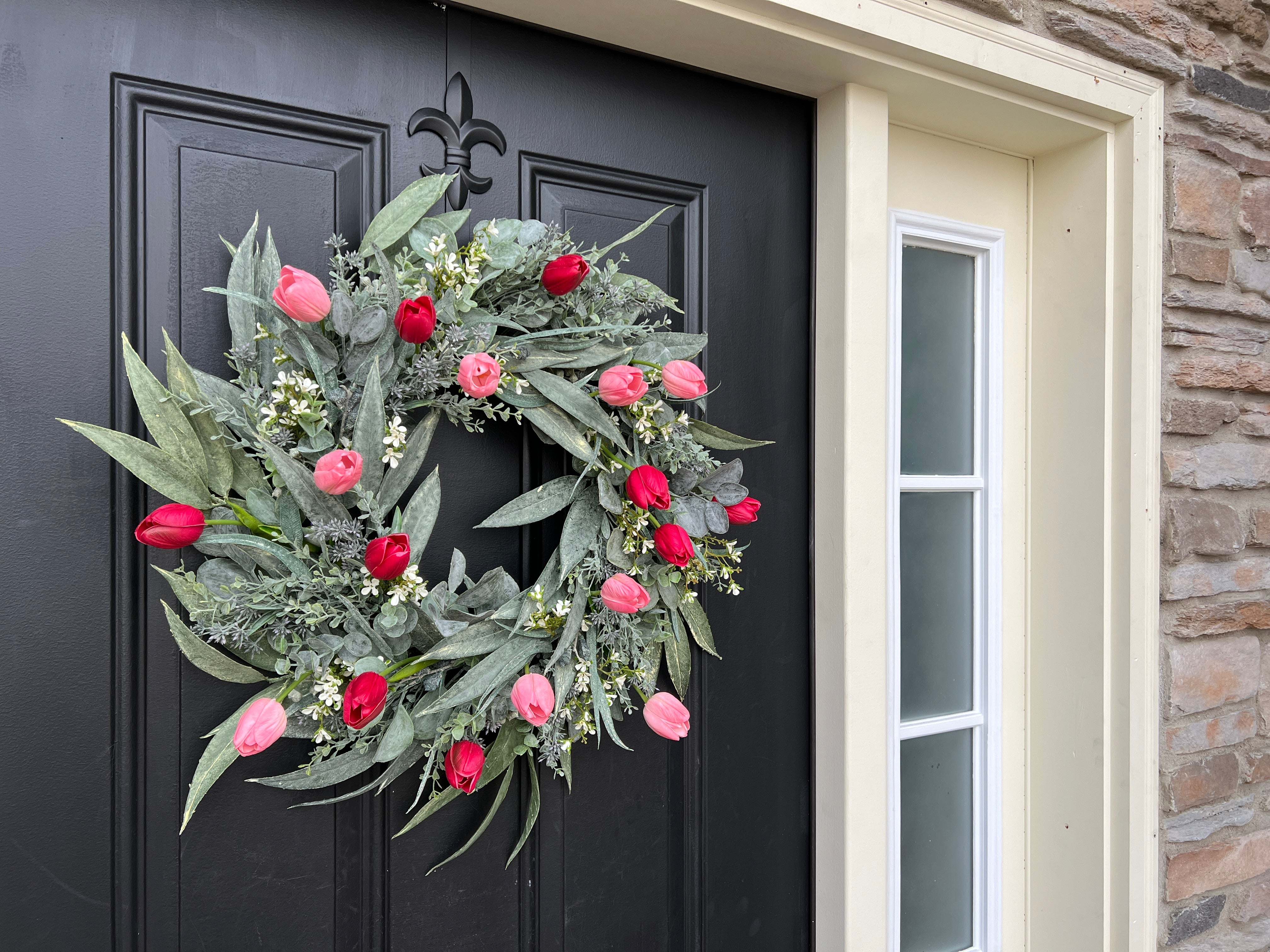 Spring Tulip Wreath for Front Door, Pink and Red Tulip Bouquet, Valentine's Day Wreath & Gifts for Her