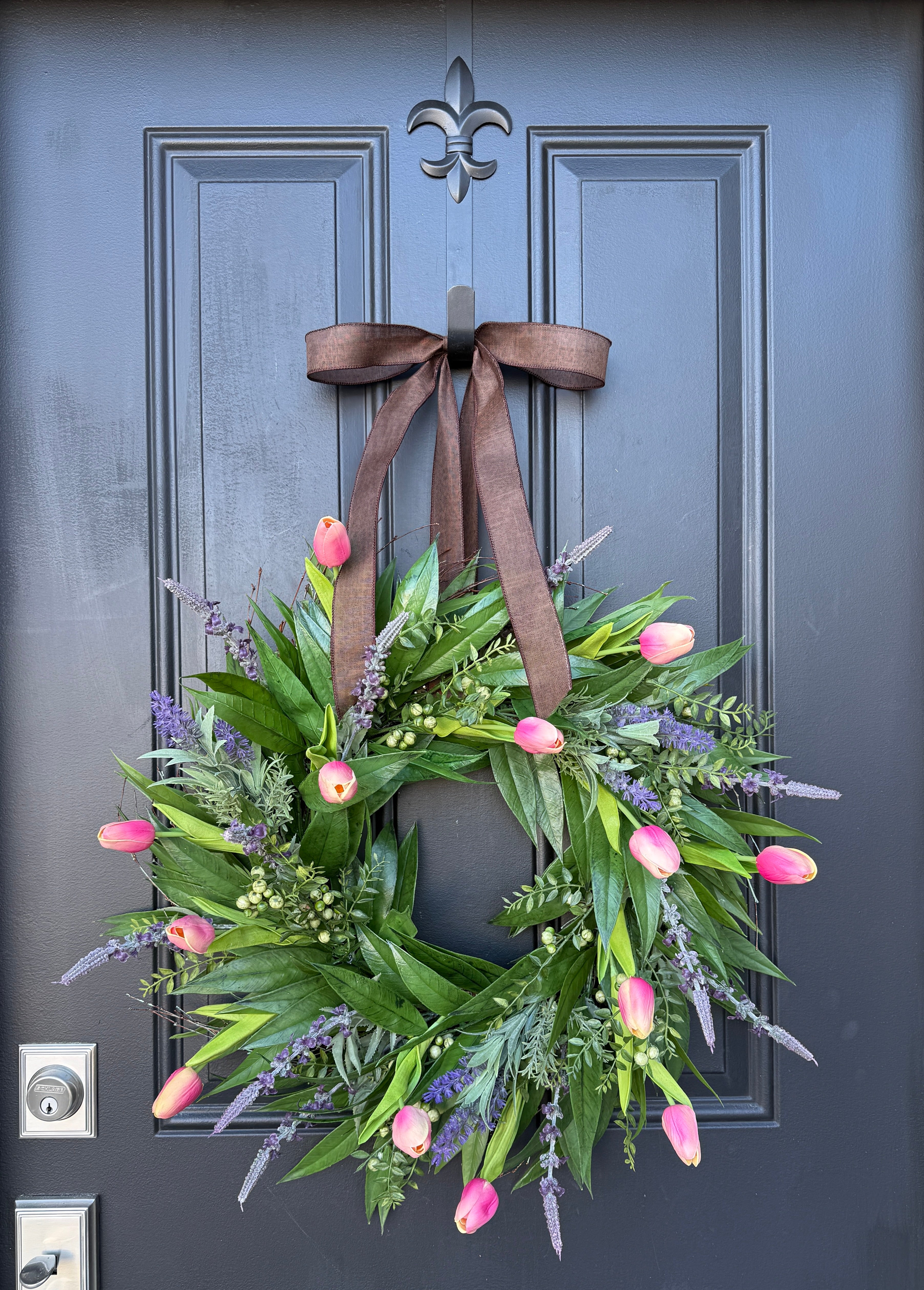 Spring and Summer Wreath with Pink Tulips and Lavender - Natural Touch Pink Tulip Wreaths