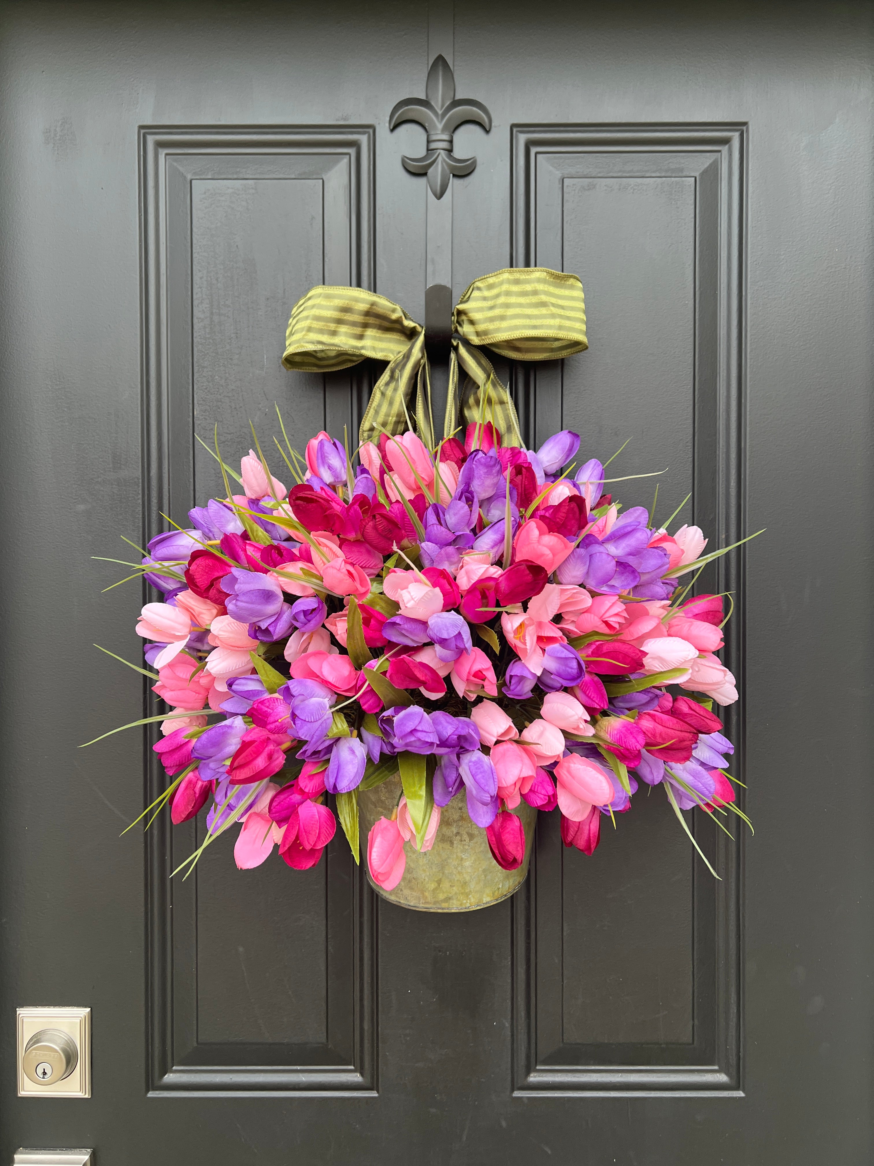 Pink and Purple Tulip Bucket Wreath for Spring, Front Door Galvanized Container with Tulips