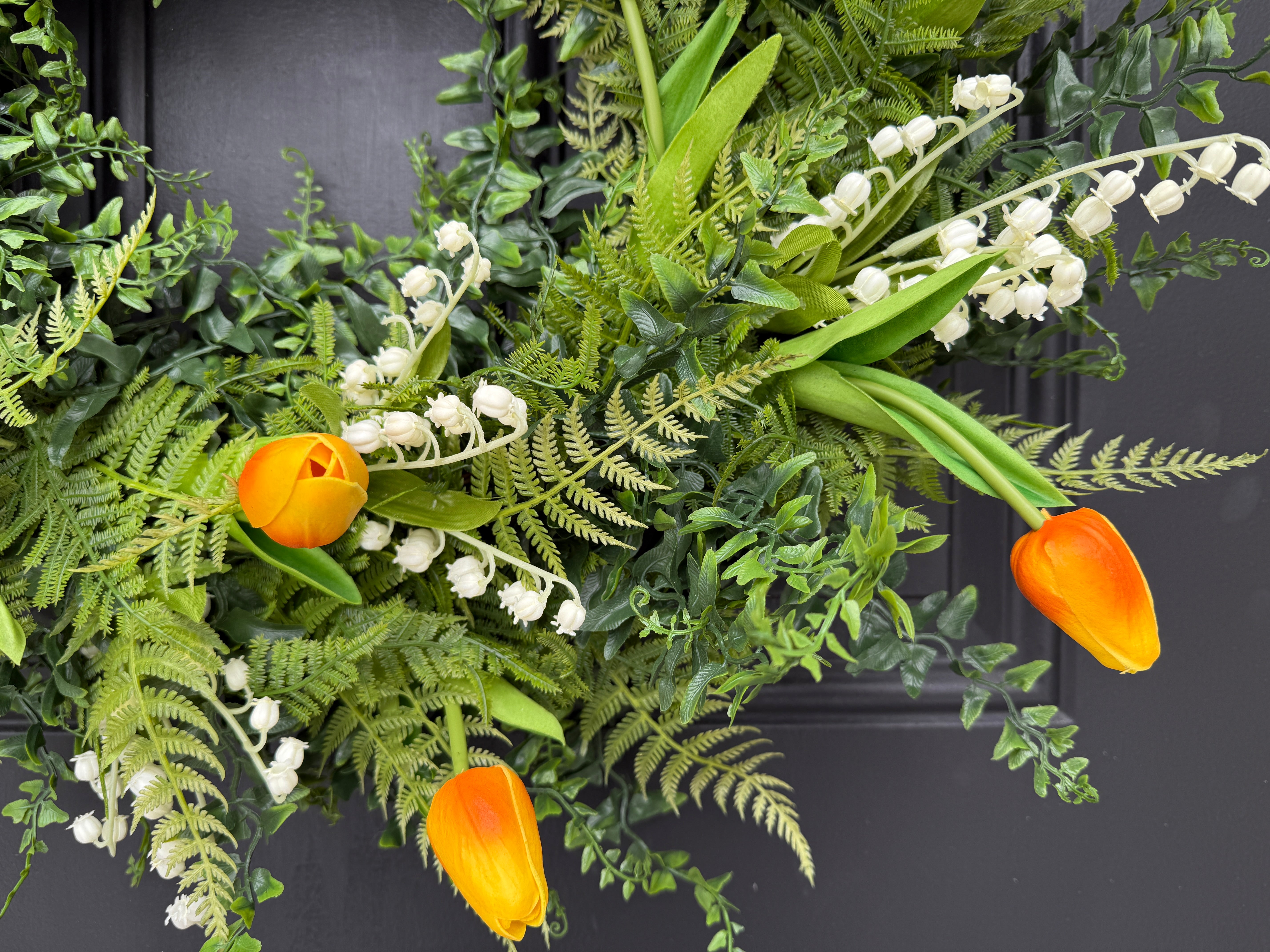 Spring Fern Wreath - Fern, Orange Tulips and Lily of the Valley Door Decoration