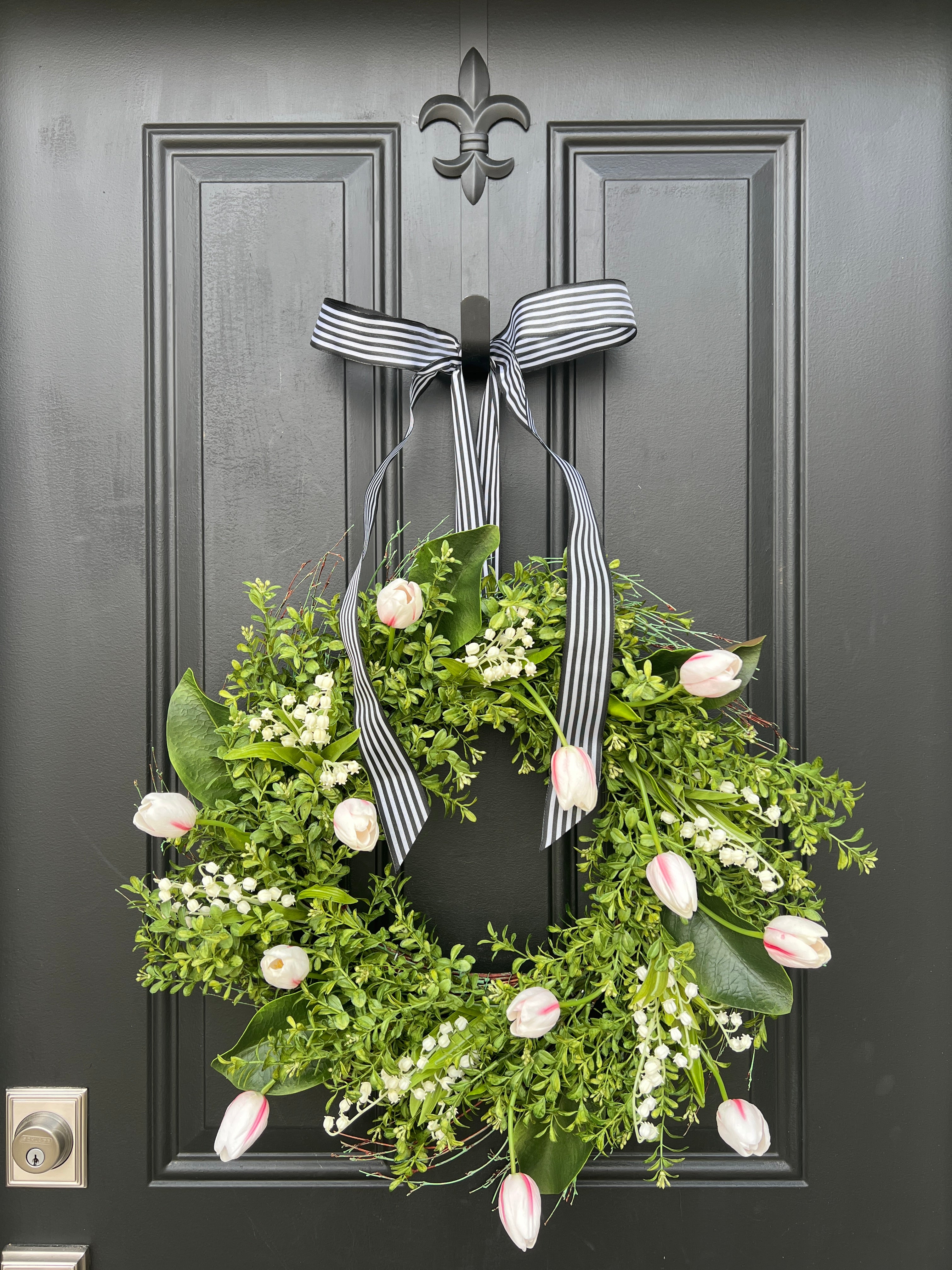 Spring Tulip Wreath with Coral & Celery Tulips, Boxwood – Easter Front Door Decor