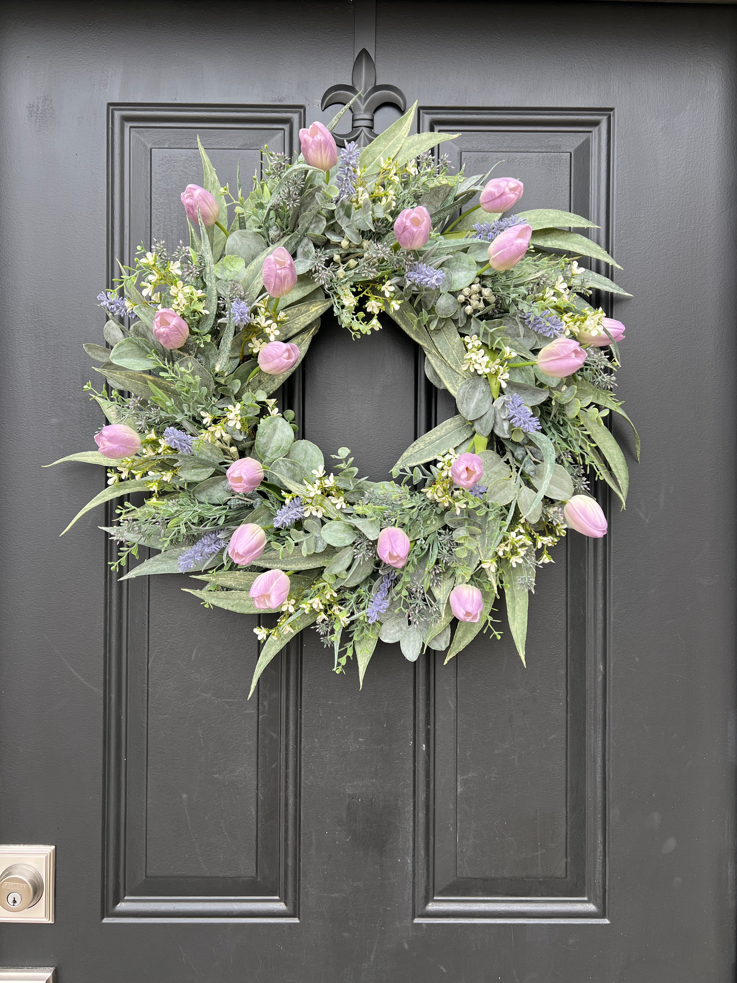 Spring and Summer Wreath with Pink Tulips and Lavender - Natural Touch Pink Tulip Wreaths