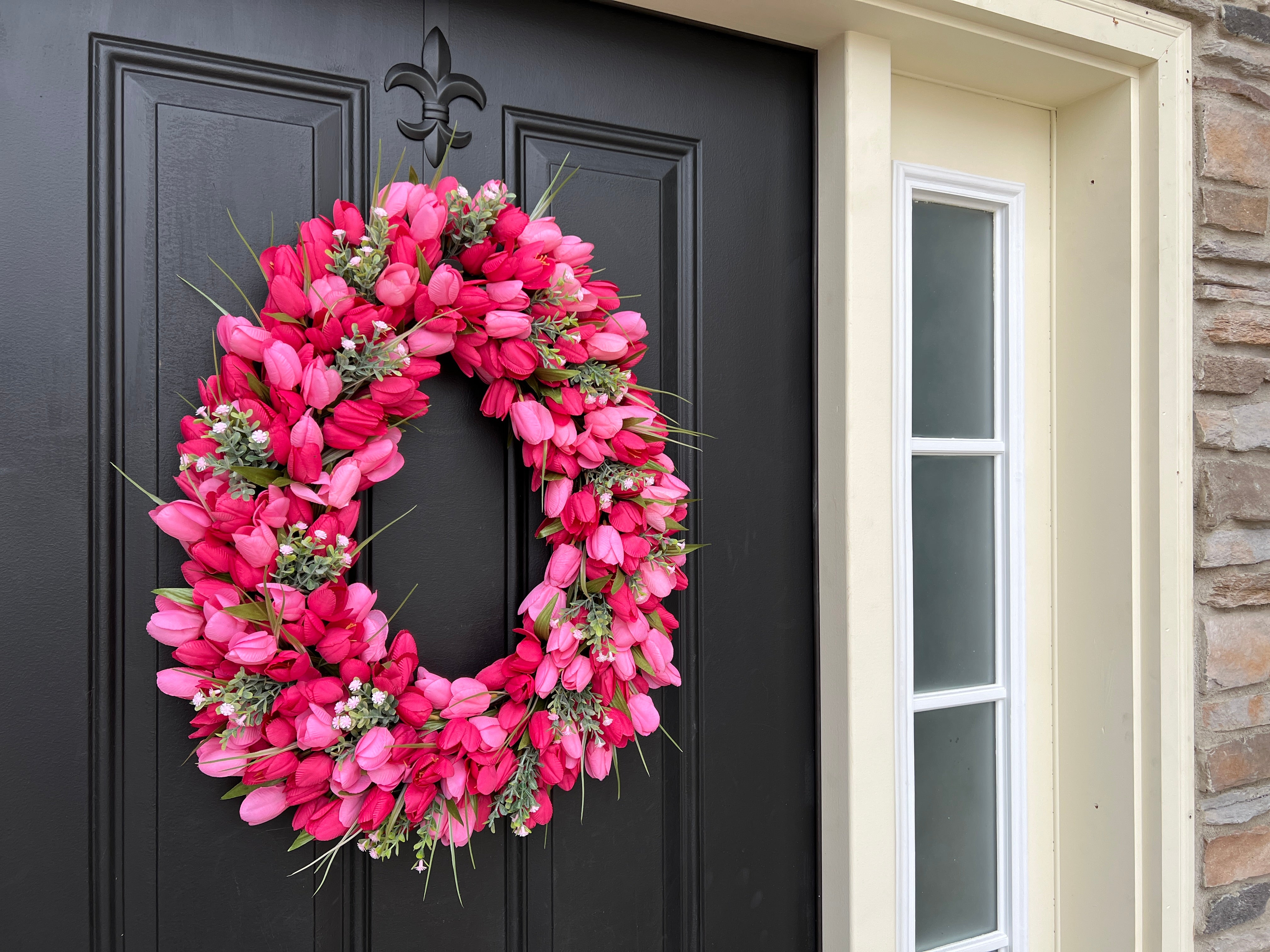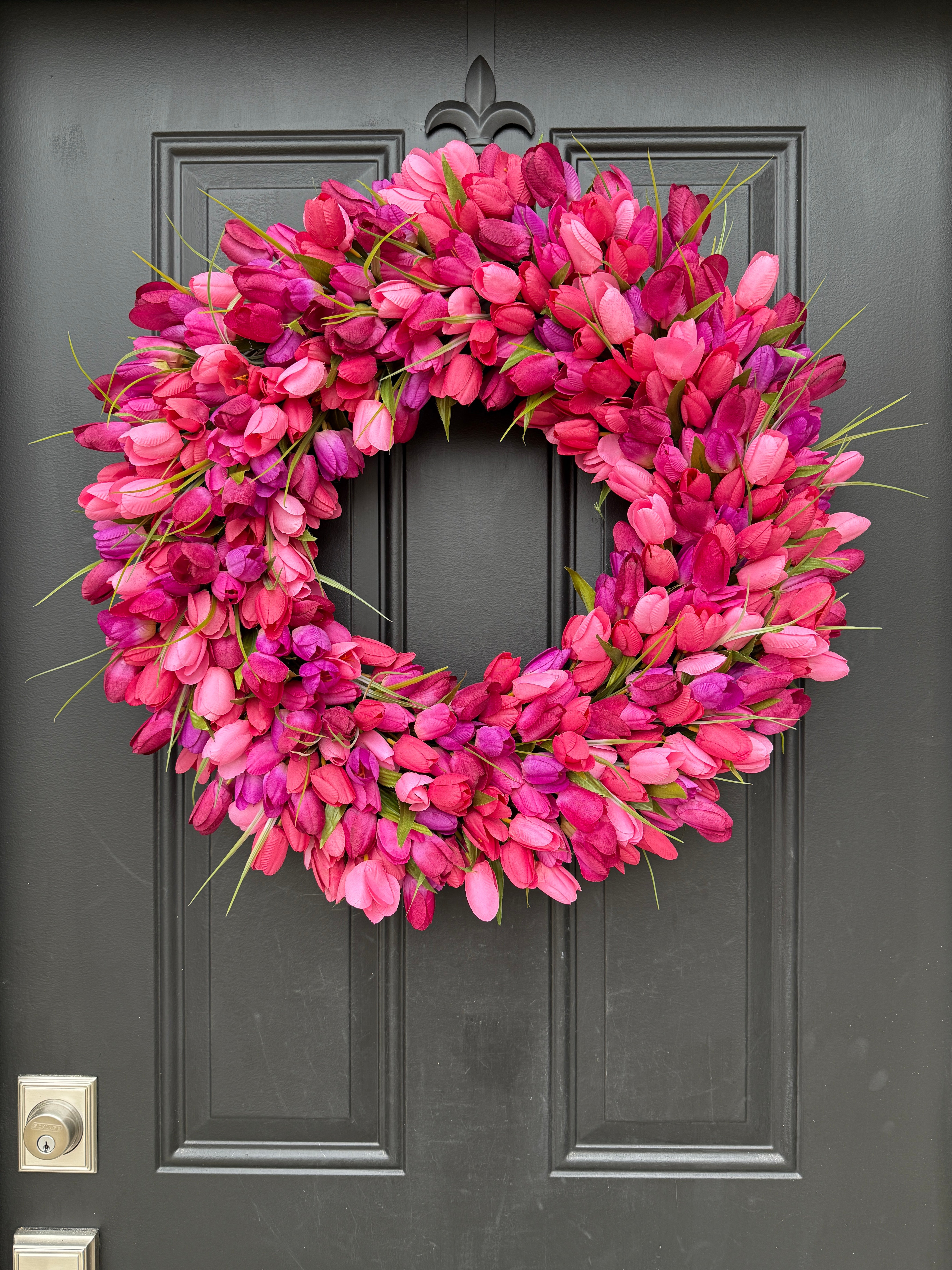 Pink and Purple Tulip Wreath for Spring, Front Door Wreath with Tulips